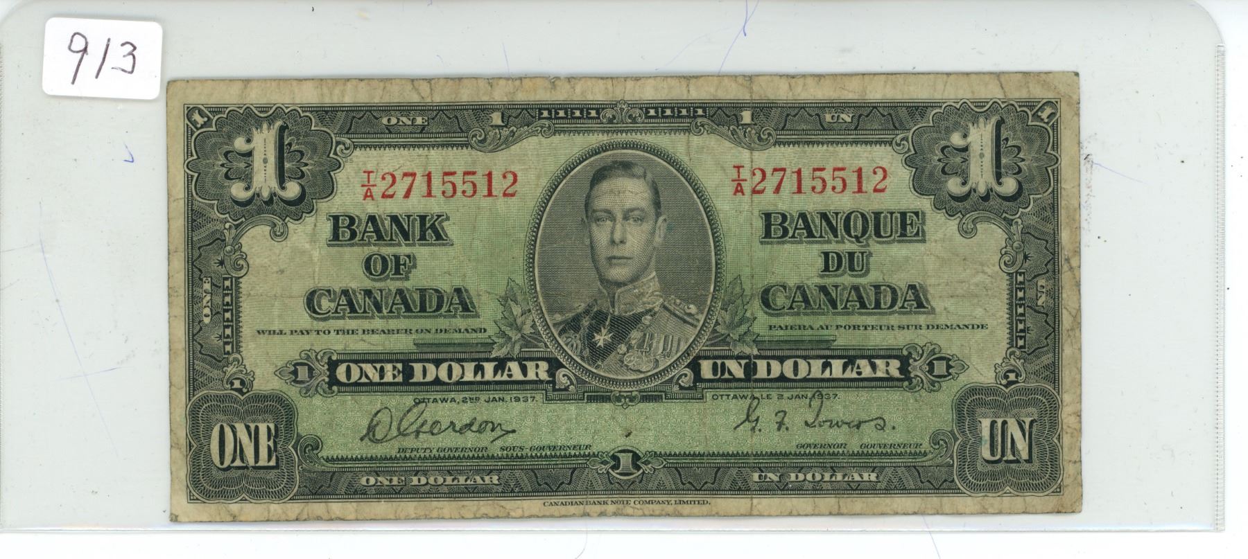 1937 Bank of Canada, 1 dollar bill - Gordon/Towers - T/A 2715512