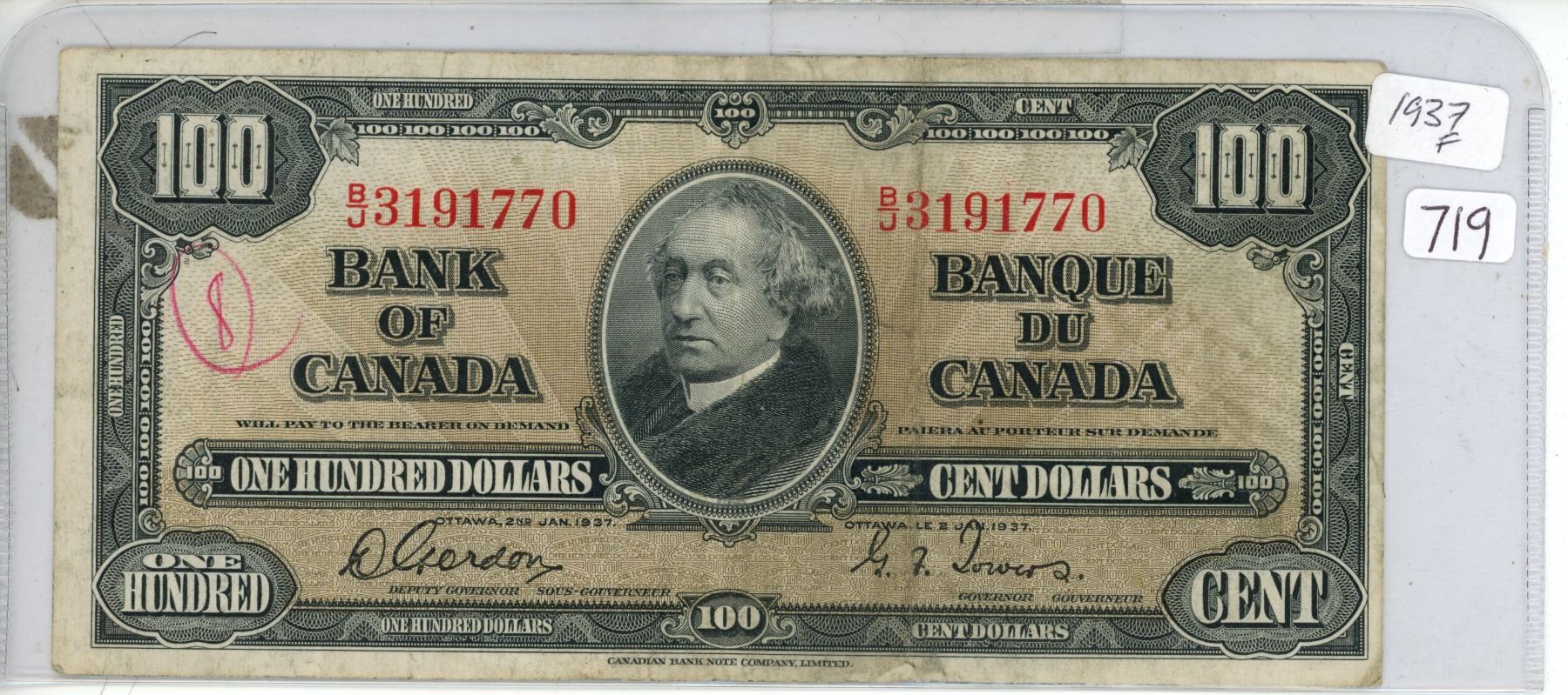 1937 Bank of Canada $100, Gordon/Towers, # B/J 3191770