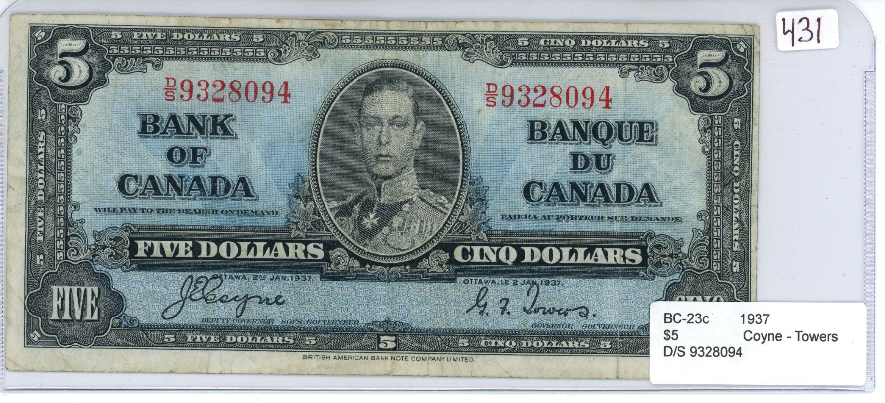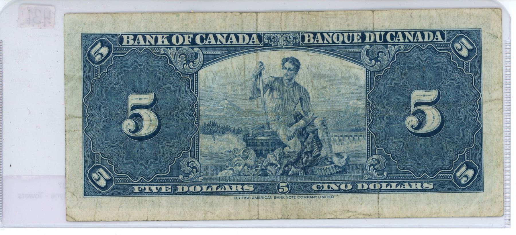 1937 Bank of Canada $5 bill, Coyne/Towers, # D/S 9328094