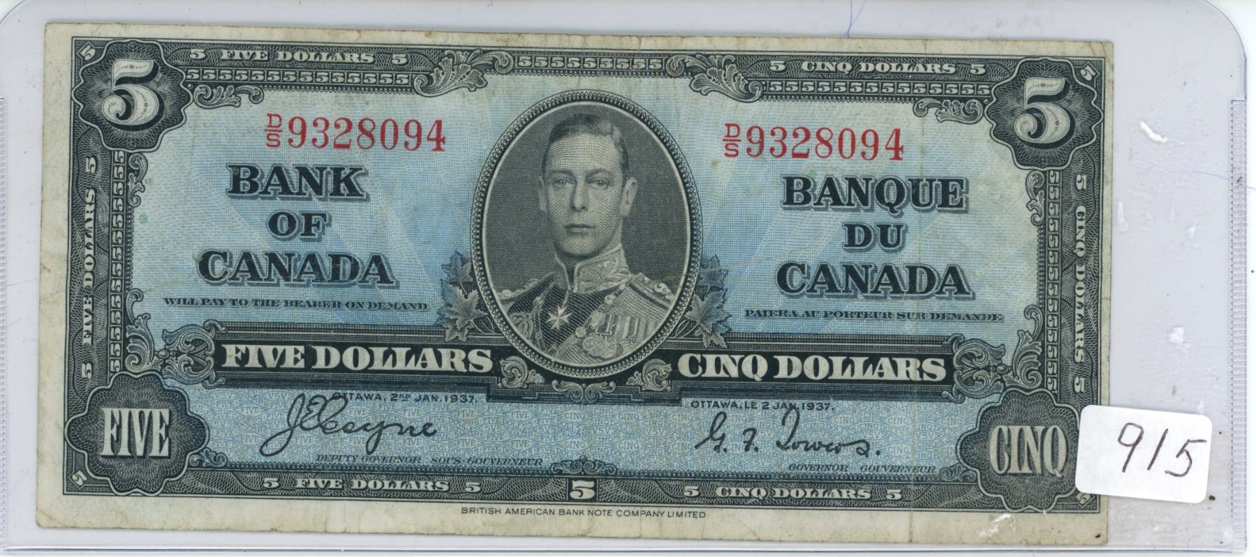 1937 Bank of Canada, 5 dollar bill - Coyne/Towers - D/S 9328094