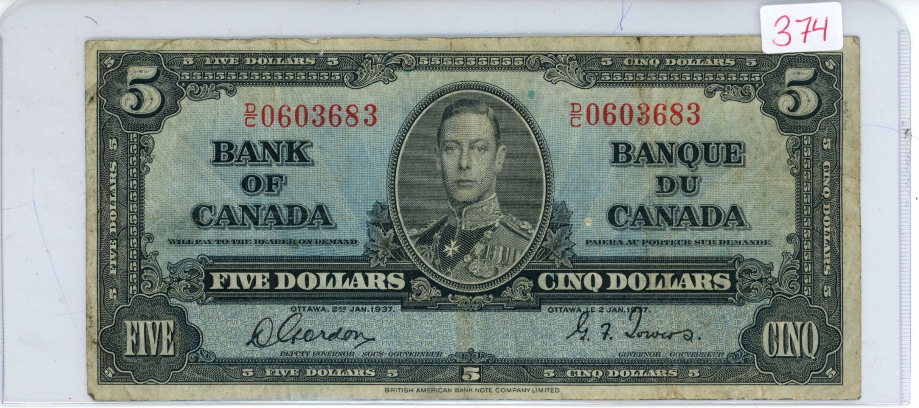 1937 Bank of Canada 5 dollar bill - Gordon/Towers - D/C 0603683