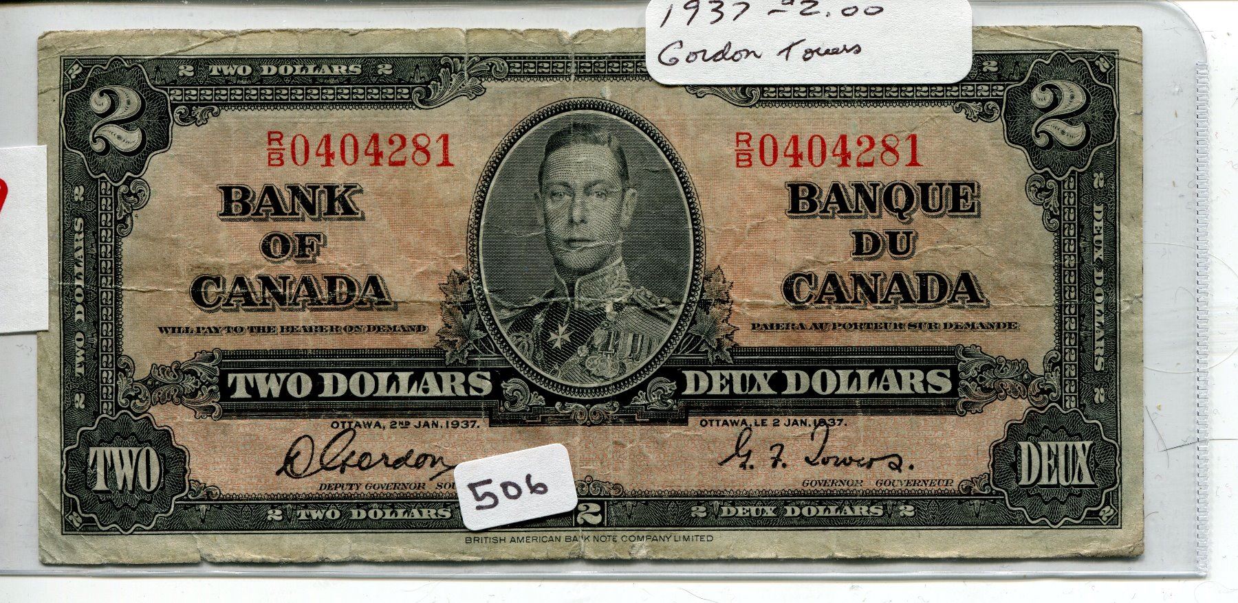 1937 CNDN $2 BANK NOTE *GORDON/TOWERS*
