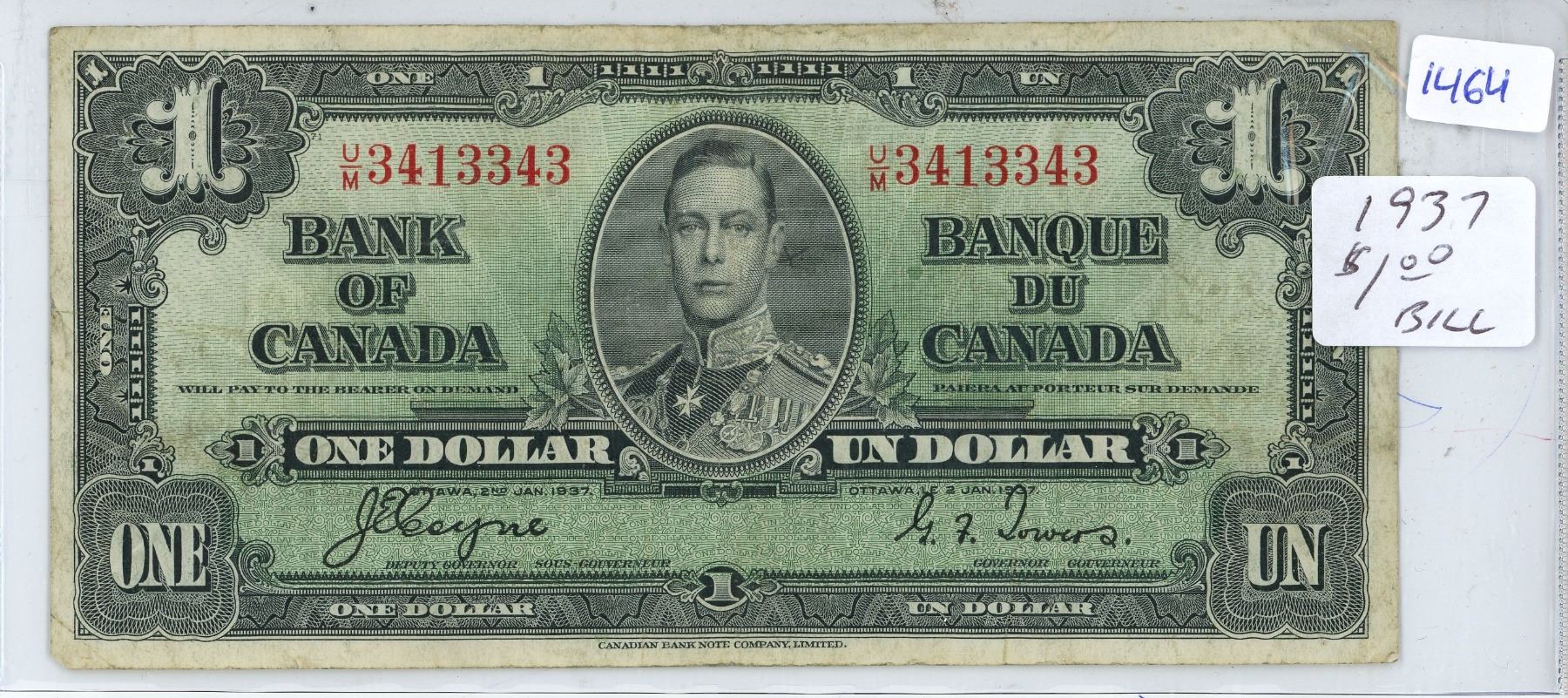 1937 Canadian 1 Dollar Bill, Coyne/Towers, U/M 3413343
