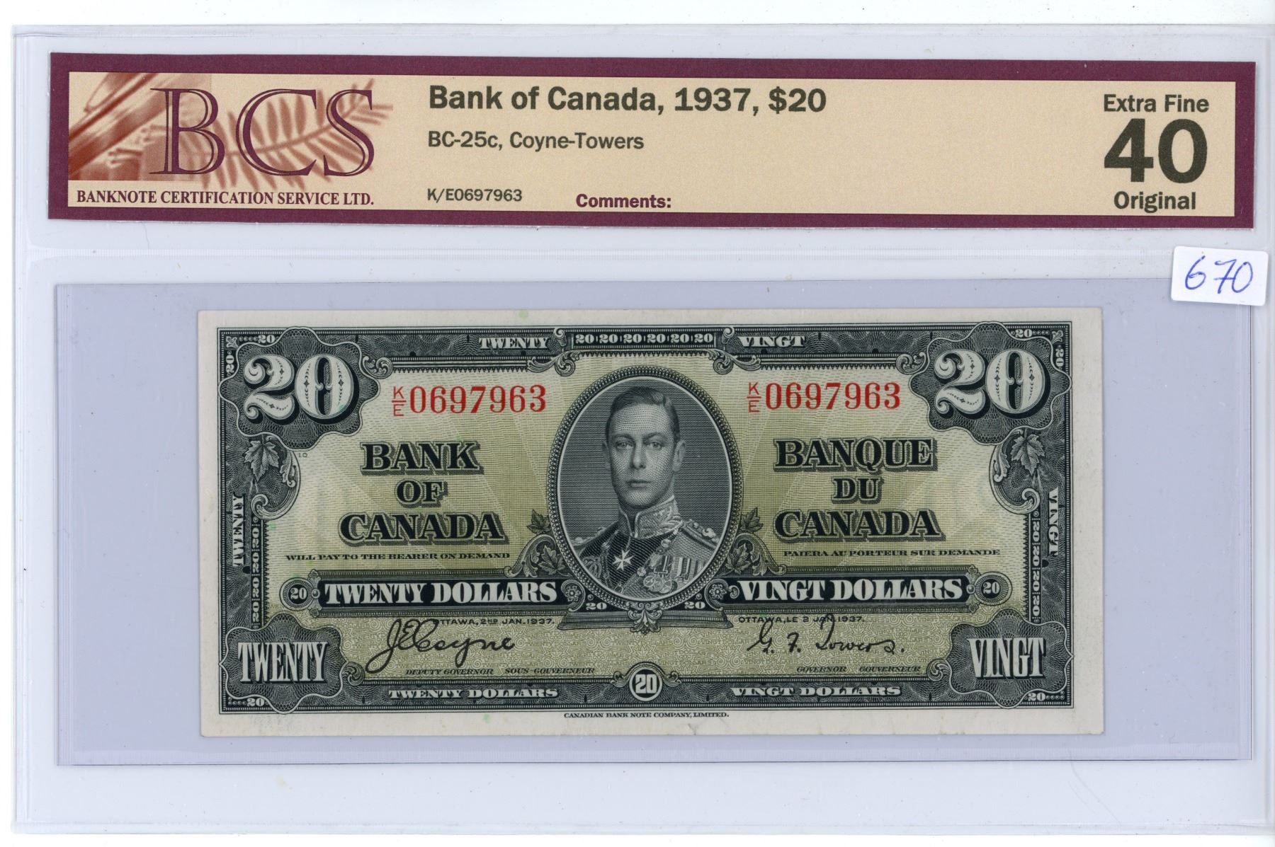 1937 Canadian 20 dollar bill - Coyne/Towers - Prefix K/E 0697963 - BCS graded EF-40