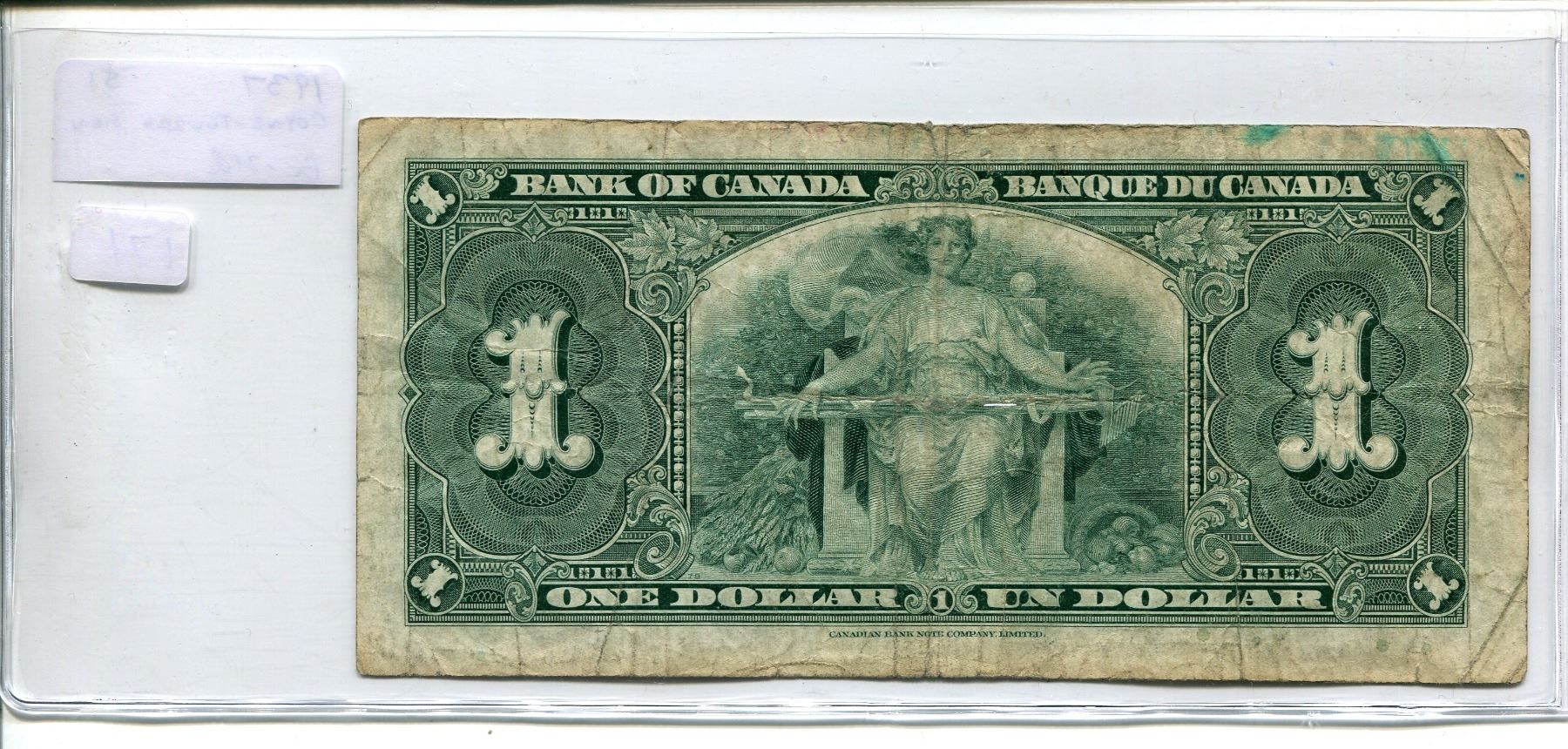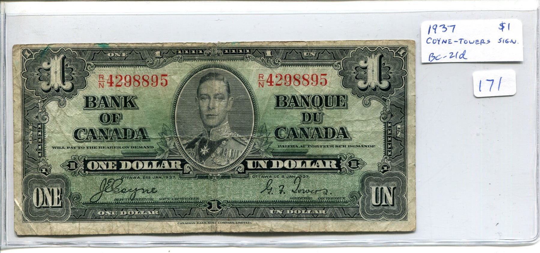1937 George VI $1 note. Coyne-Towers signatures. R/N Prefix. BC-21d. VG-8.
