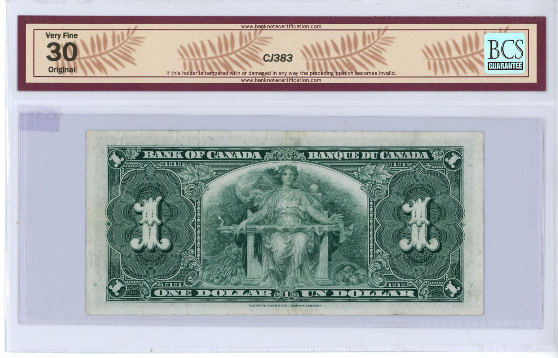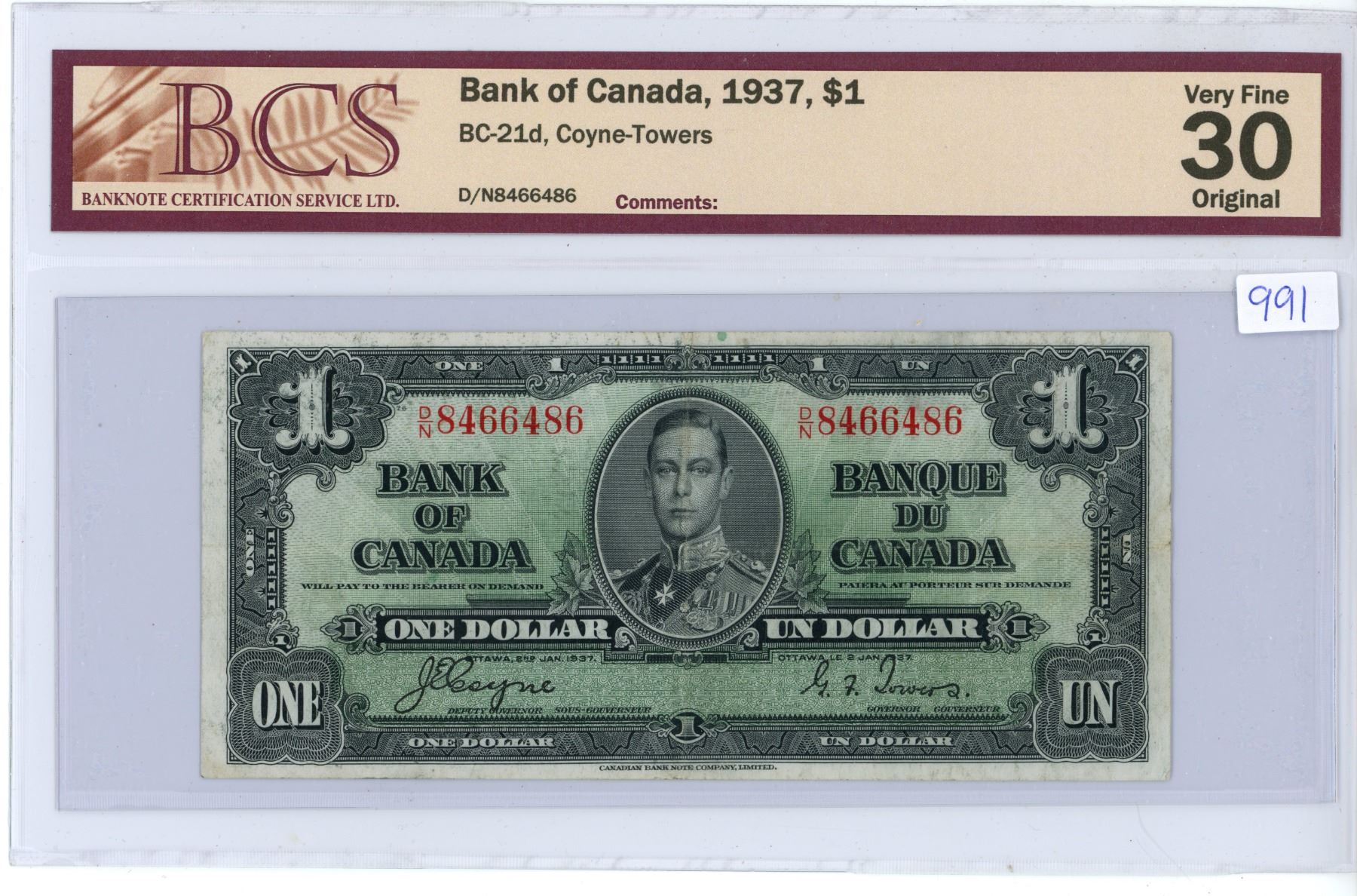 1937 Graded Canadian $1 bill - Coyne/Towers - D/N prefix - 8466486 - VF30