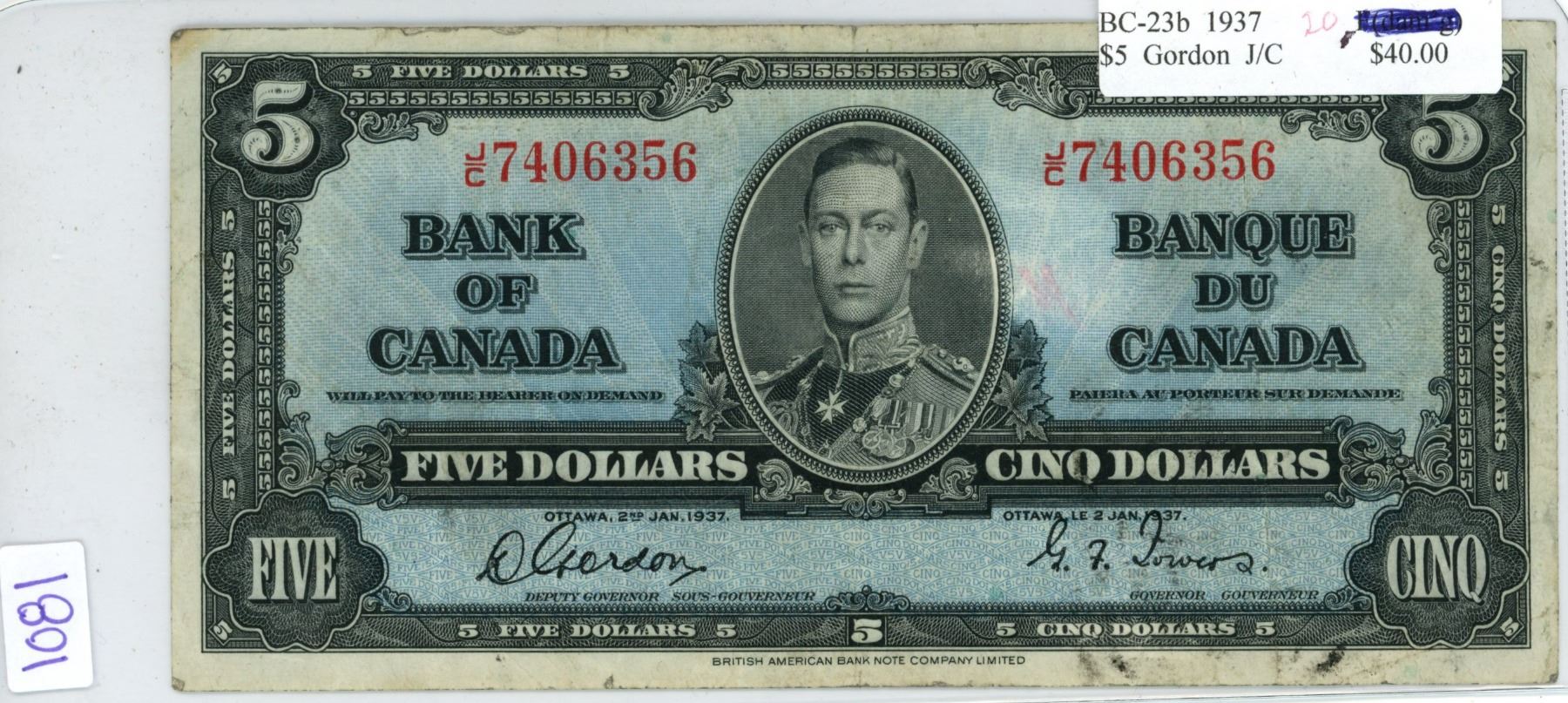 1937 K.G $5 Bill