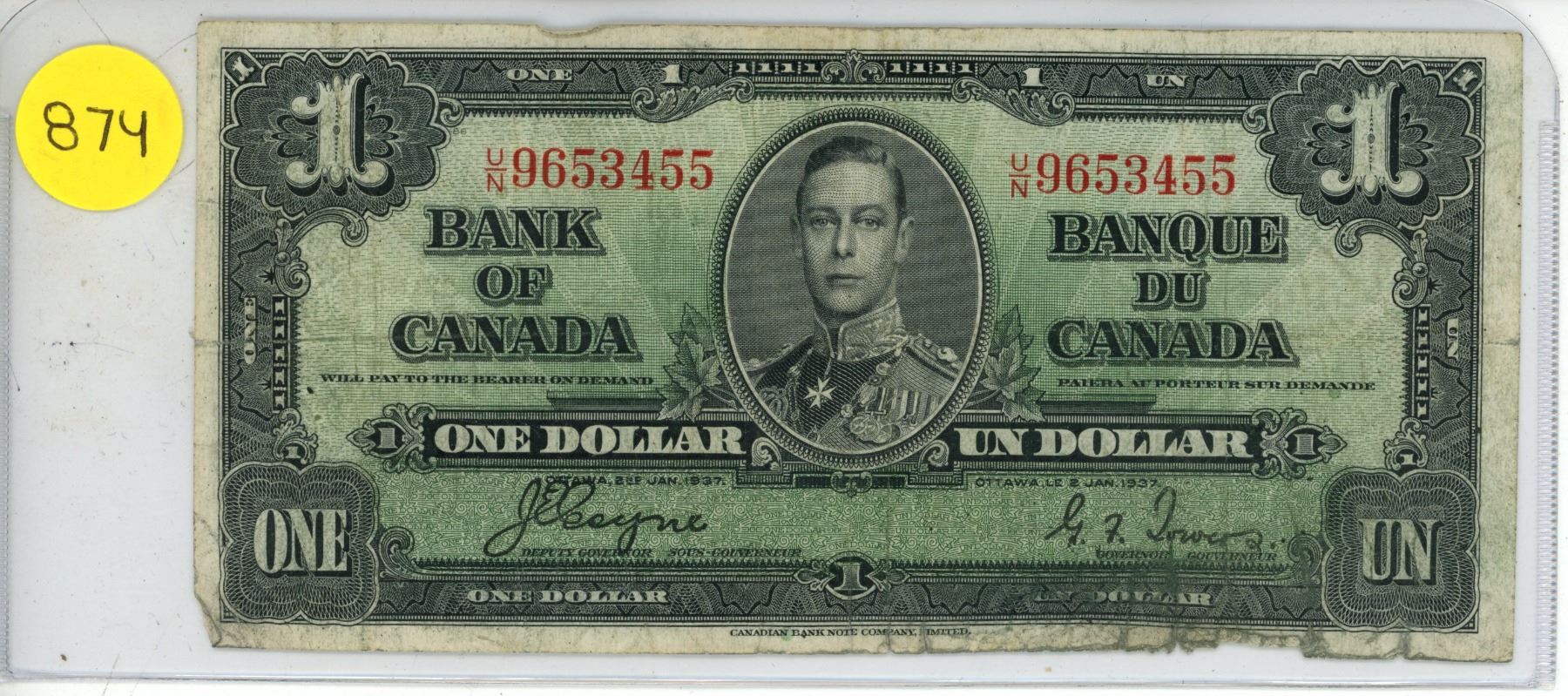1937 bank of Canada $1 bill- U/N9653455