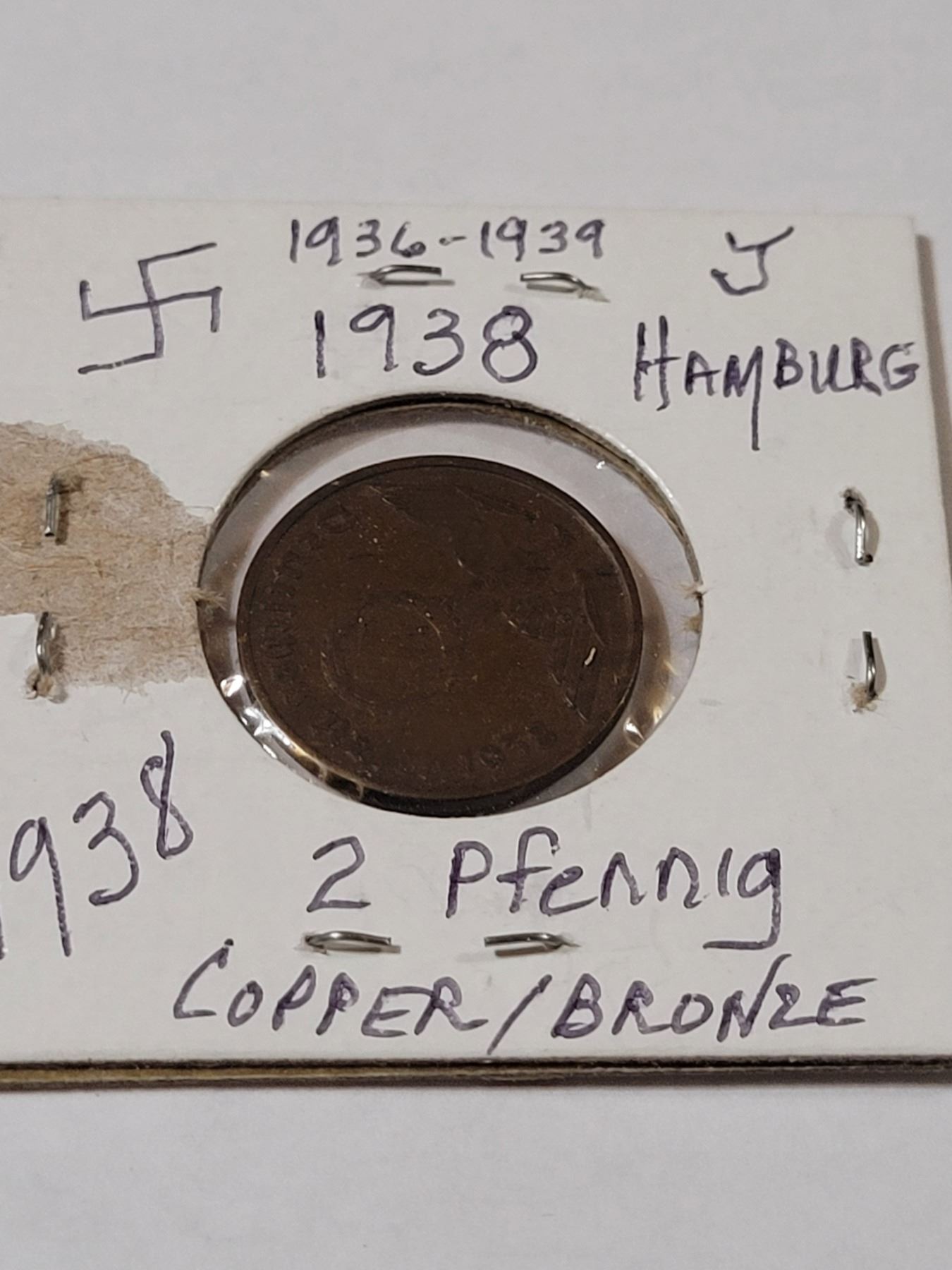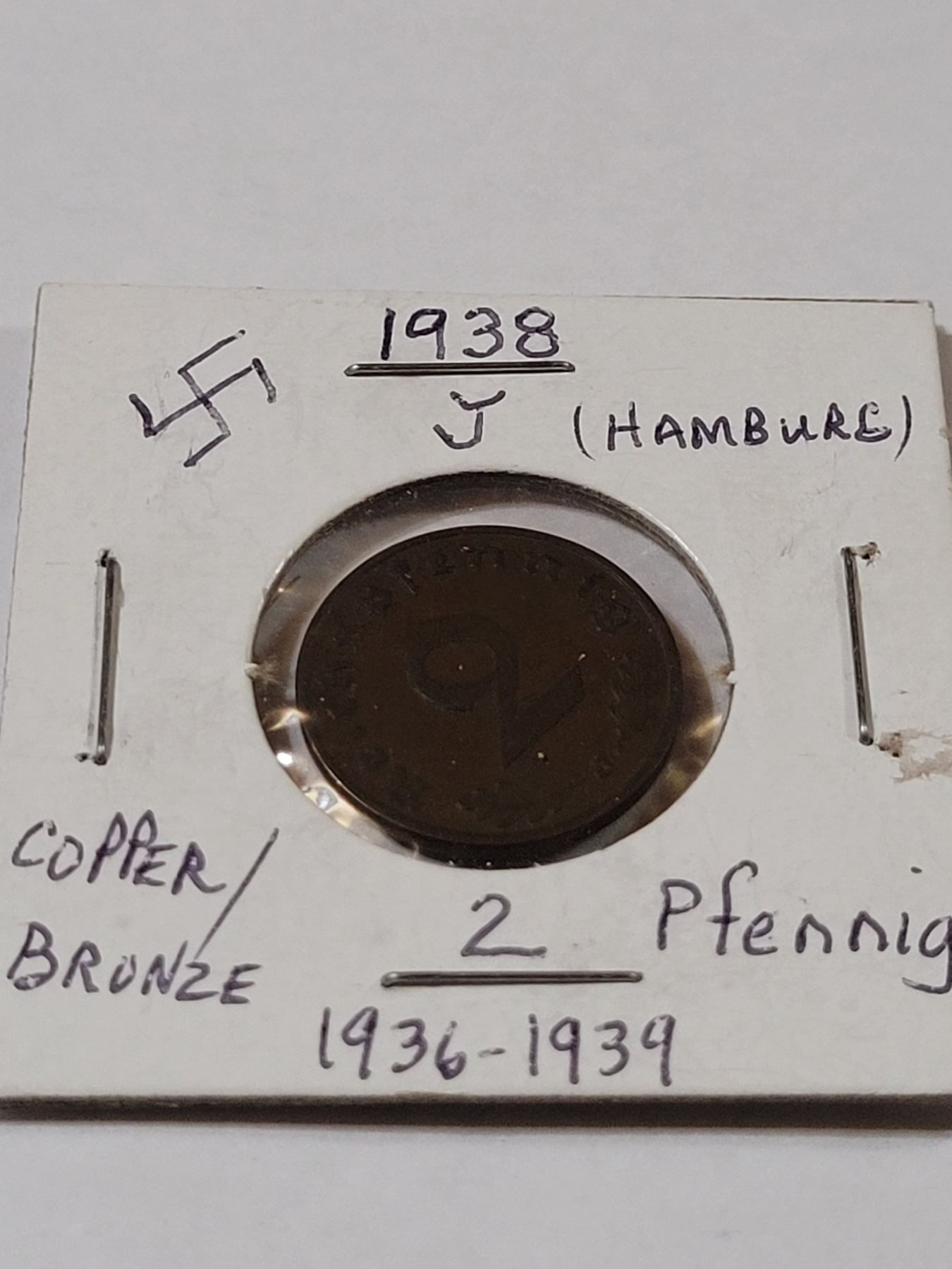 1938 2 Pfenning copper bronze coin - Hamburg, swastika