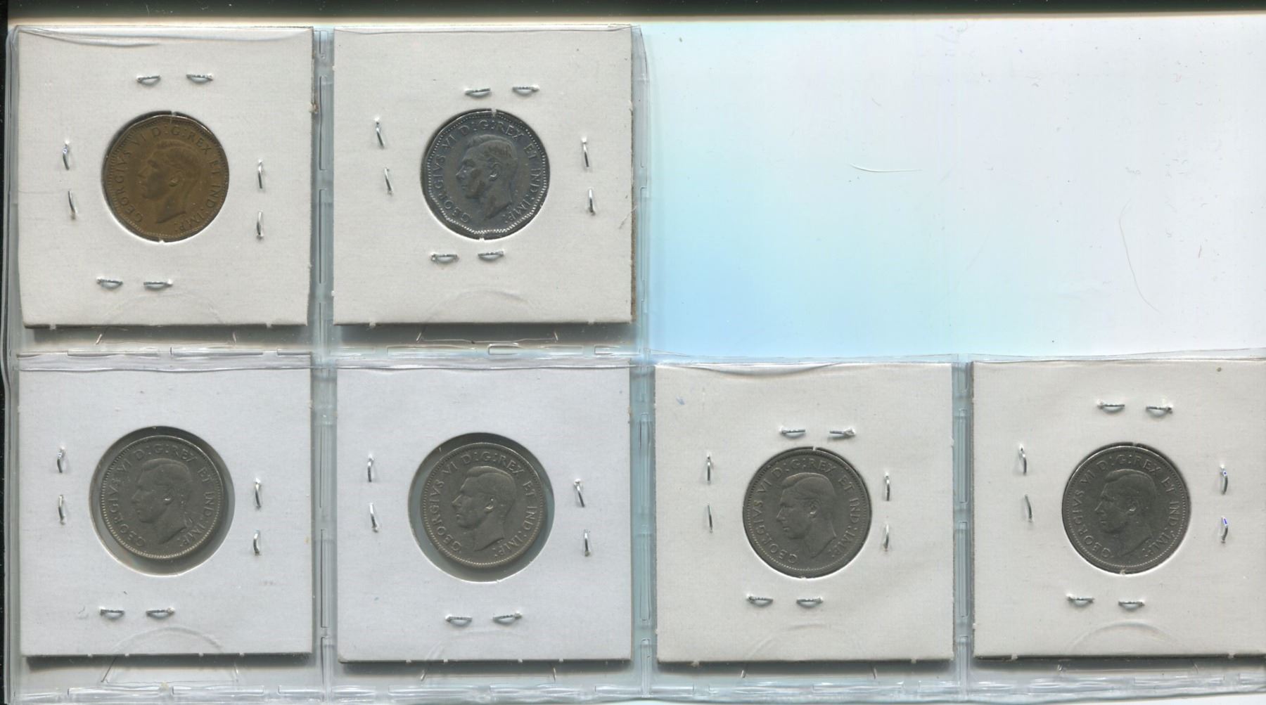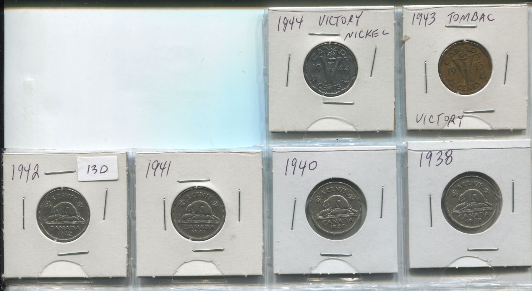 1938,40,41,42,43 Tombac victory &1944 Victory,6-Canadian 5 cent coins,King George VI