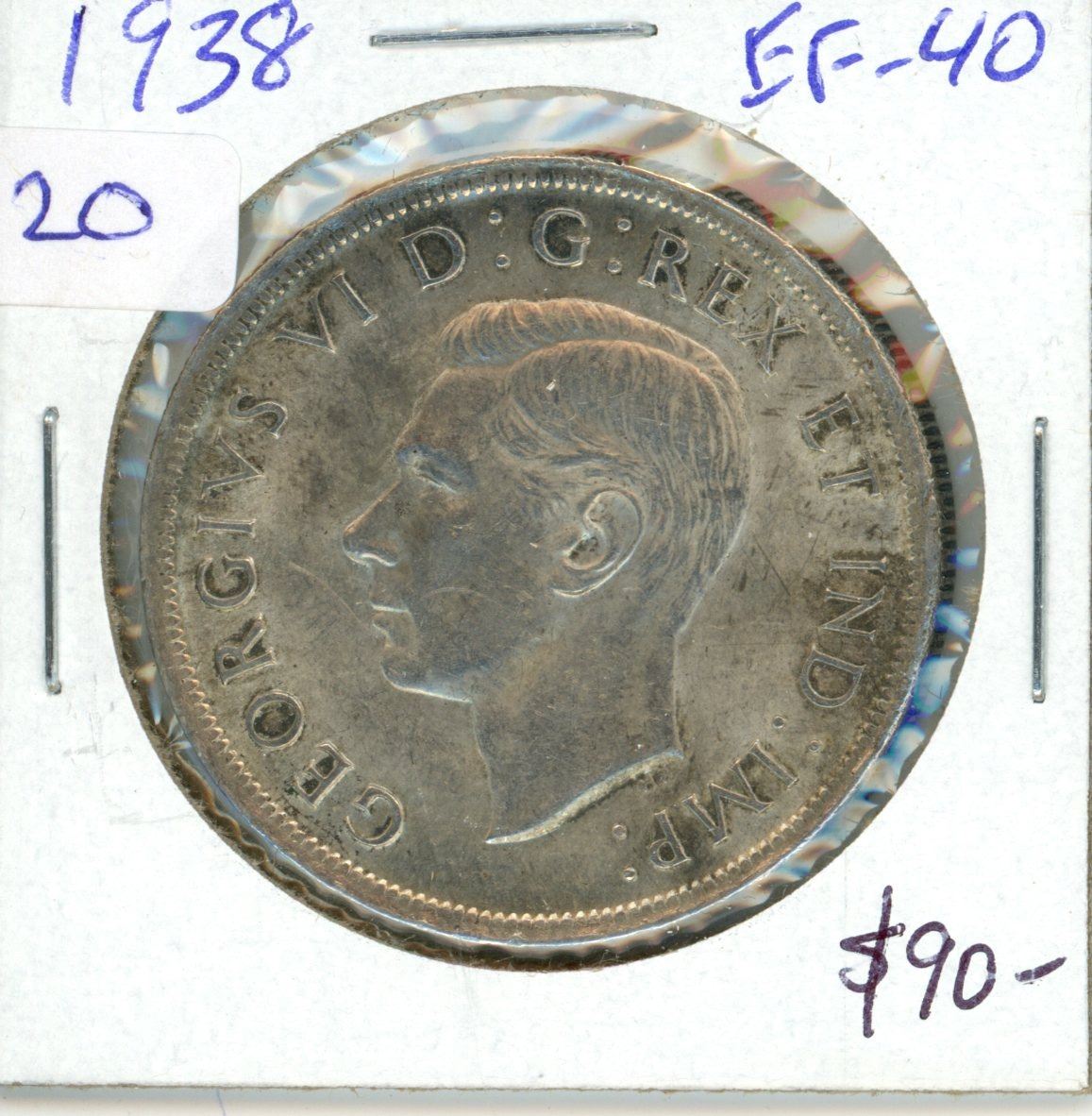 1938 Canadian Silver Dollar. EF-40. Key Date. Mintage of 90,304.