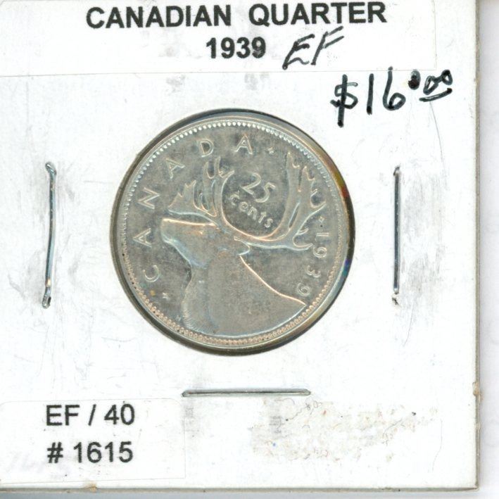 1939 Canadian Silver 25 Cents. The first year of World War II. EF-40. Nice.