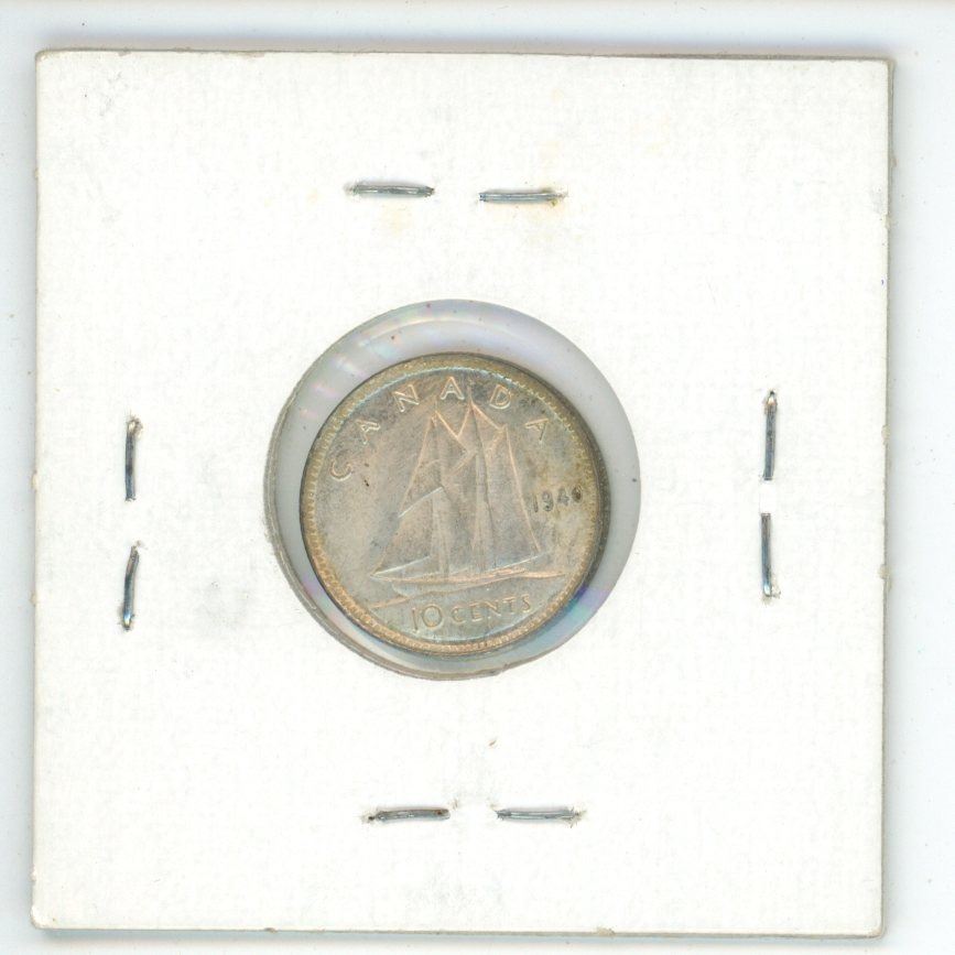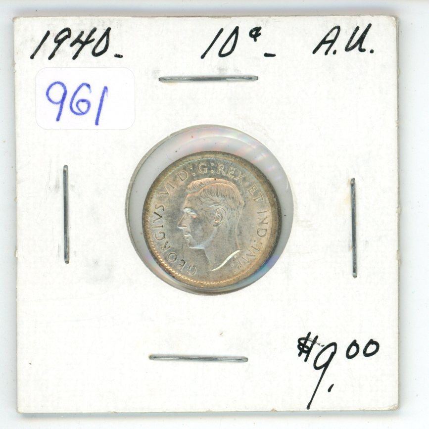1940 Canadian Silver 10 Cents. World War II issue. AU-50. Nice.