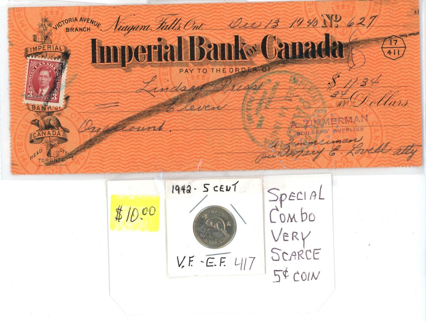 1940 Imperial Bank of Canada cheque & 1942 Canadian 5 cent nickel