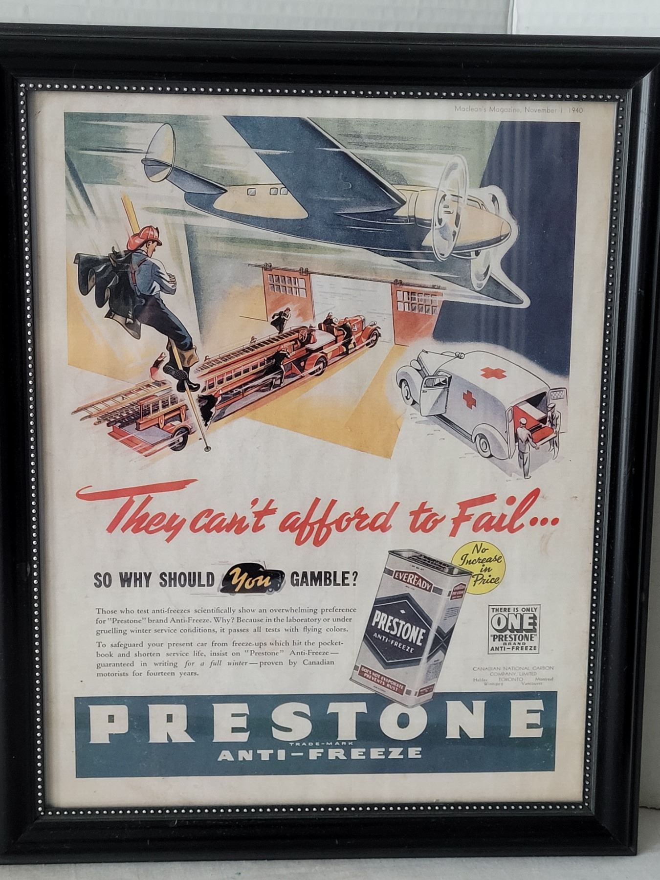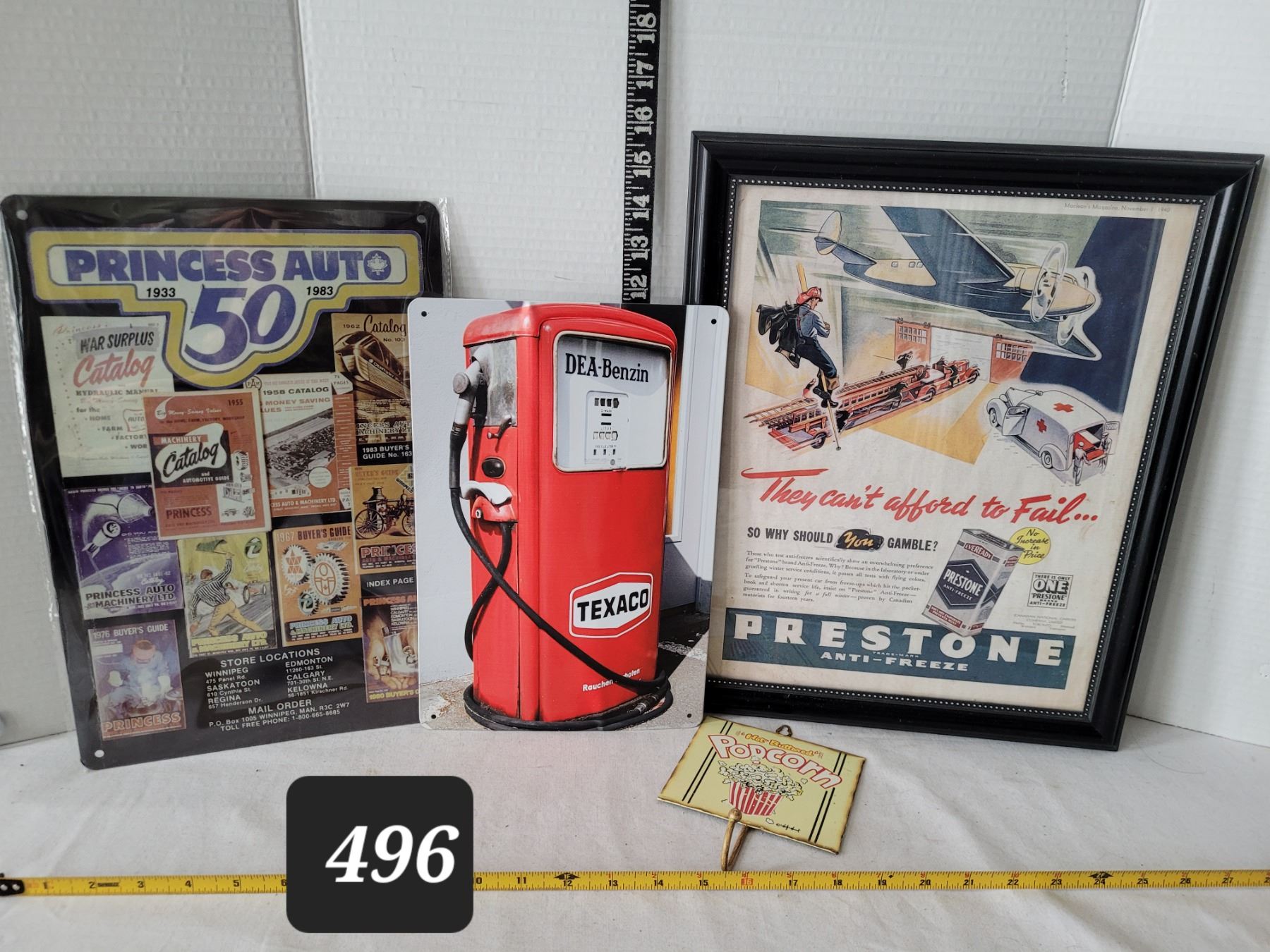 1940 framed Preston Antifreeze advertisement. Texaco & other tin signs.