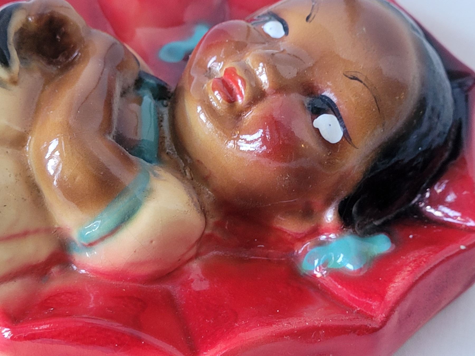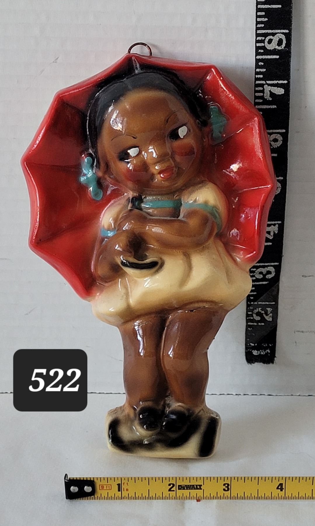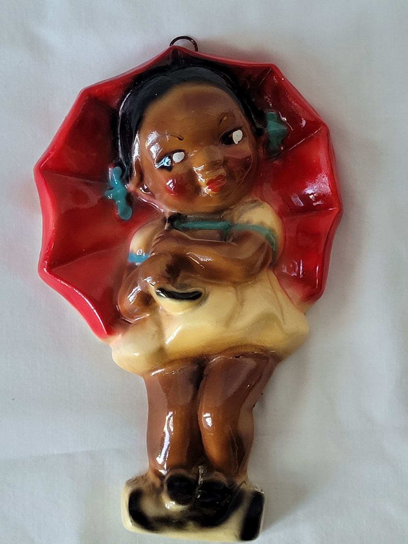 1940's-'50's Black Americana chalkware, girl with umbrella wall plaque.