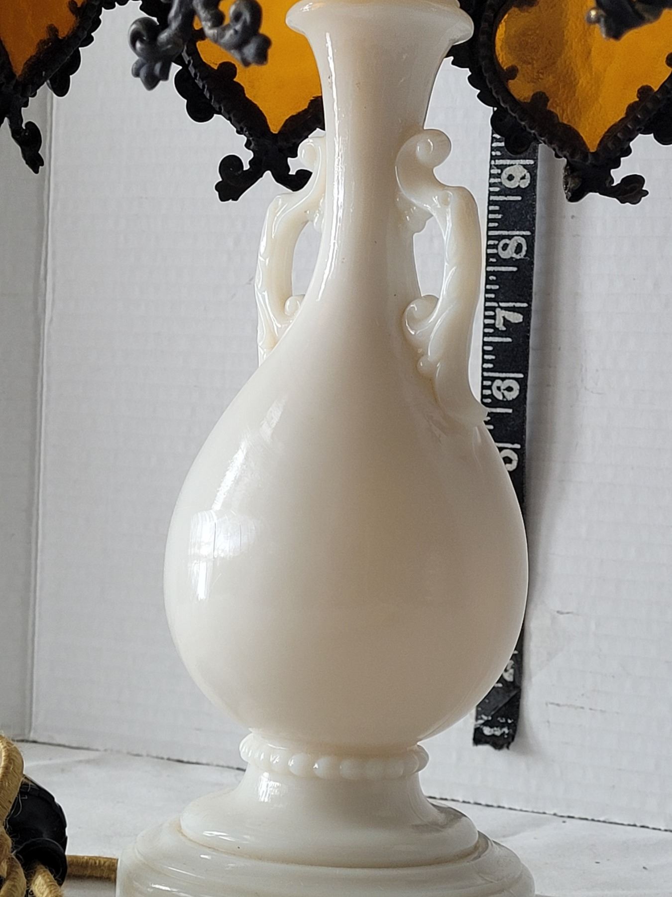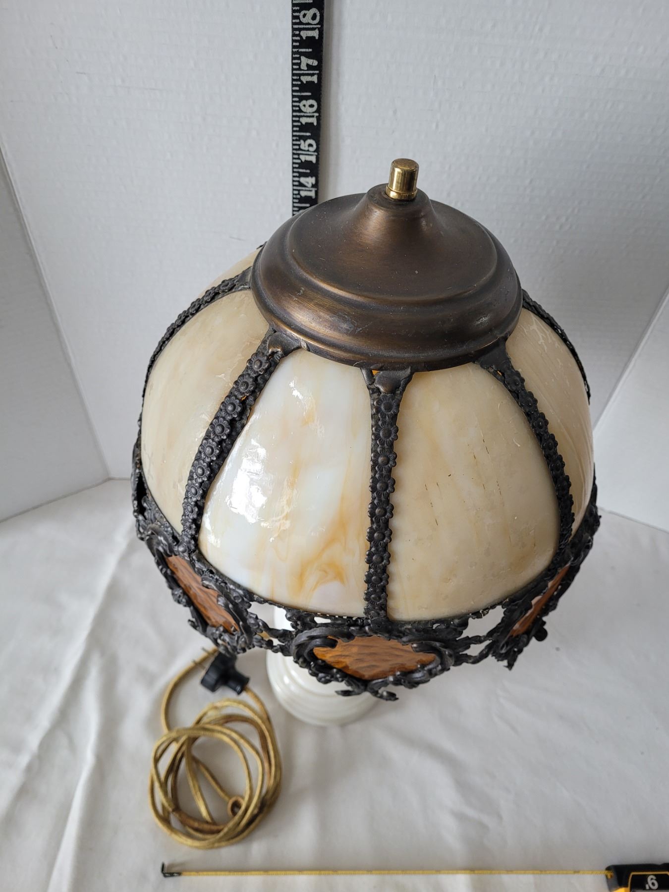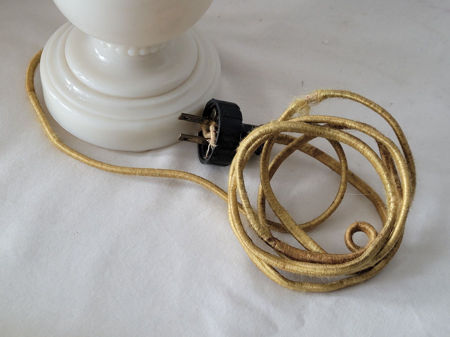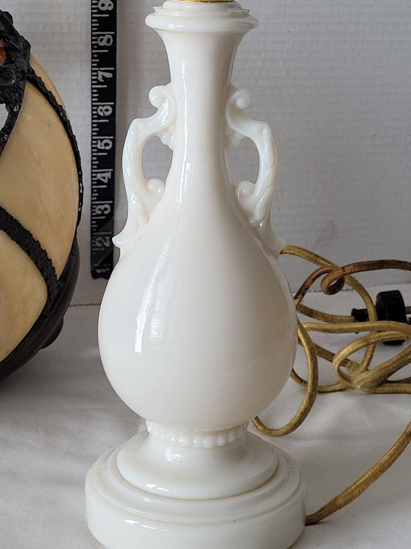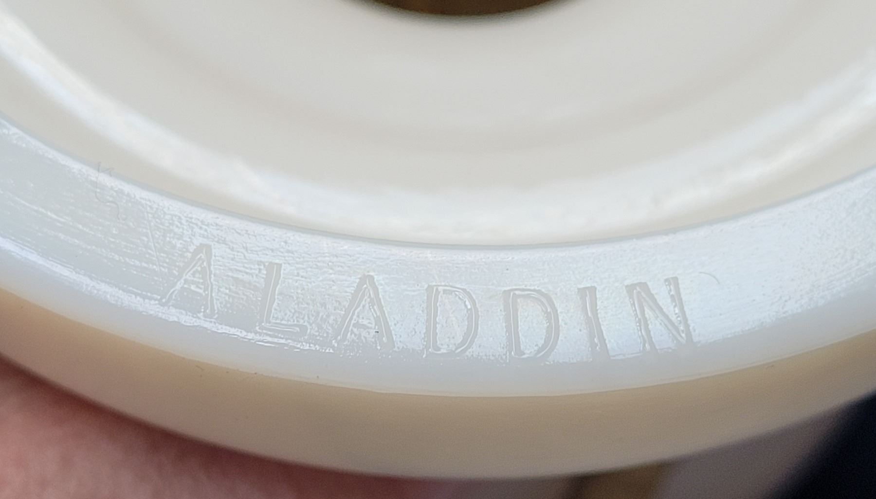 1940's Aladdin Ivory Alacite glass table lamp. Bakelite switch & original cloth cord. Shade is damaged & not original to the lamp.
