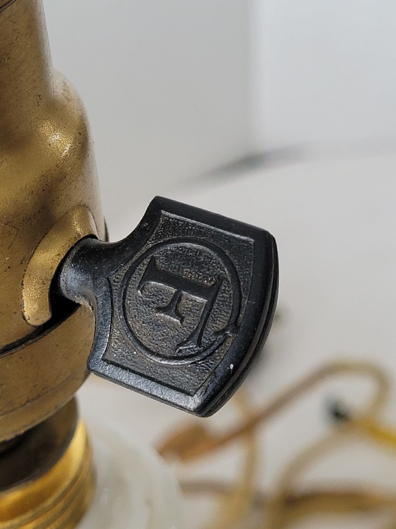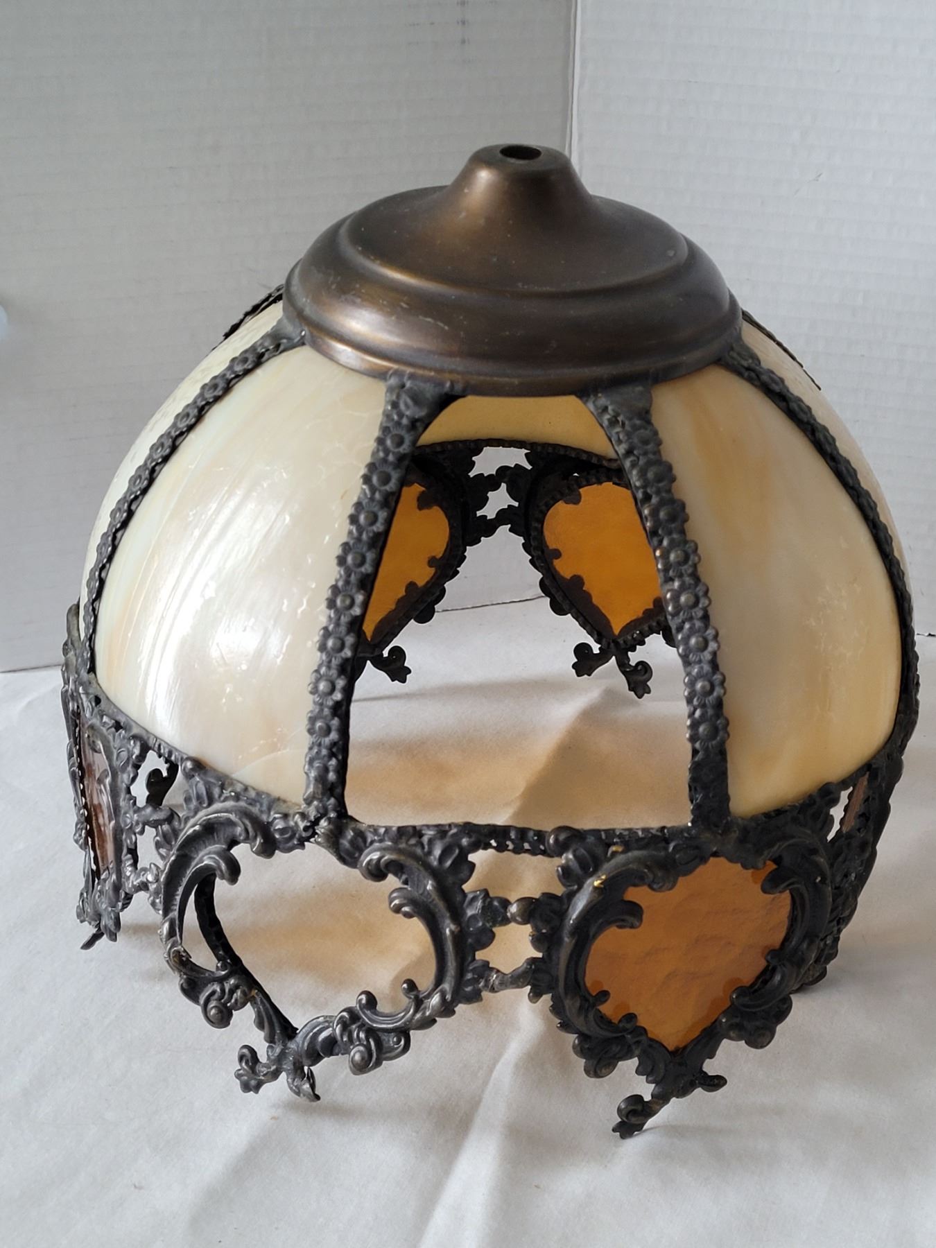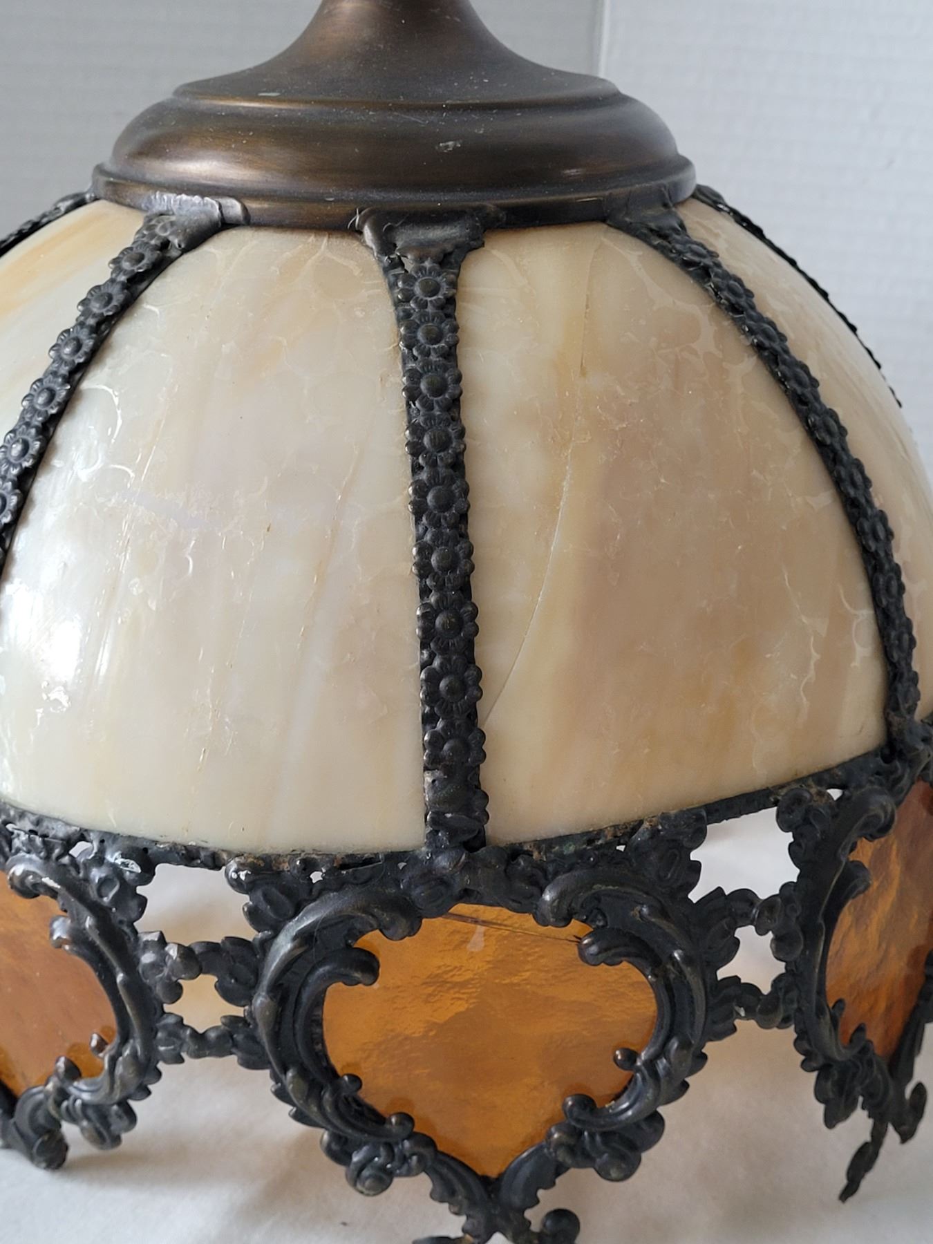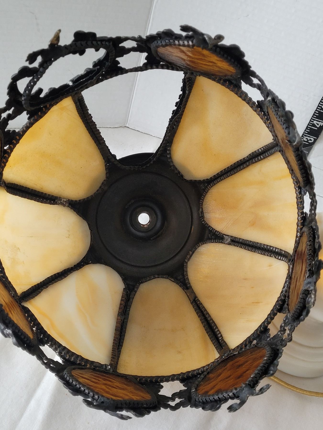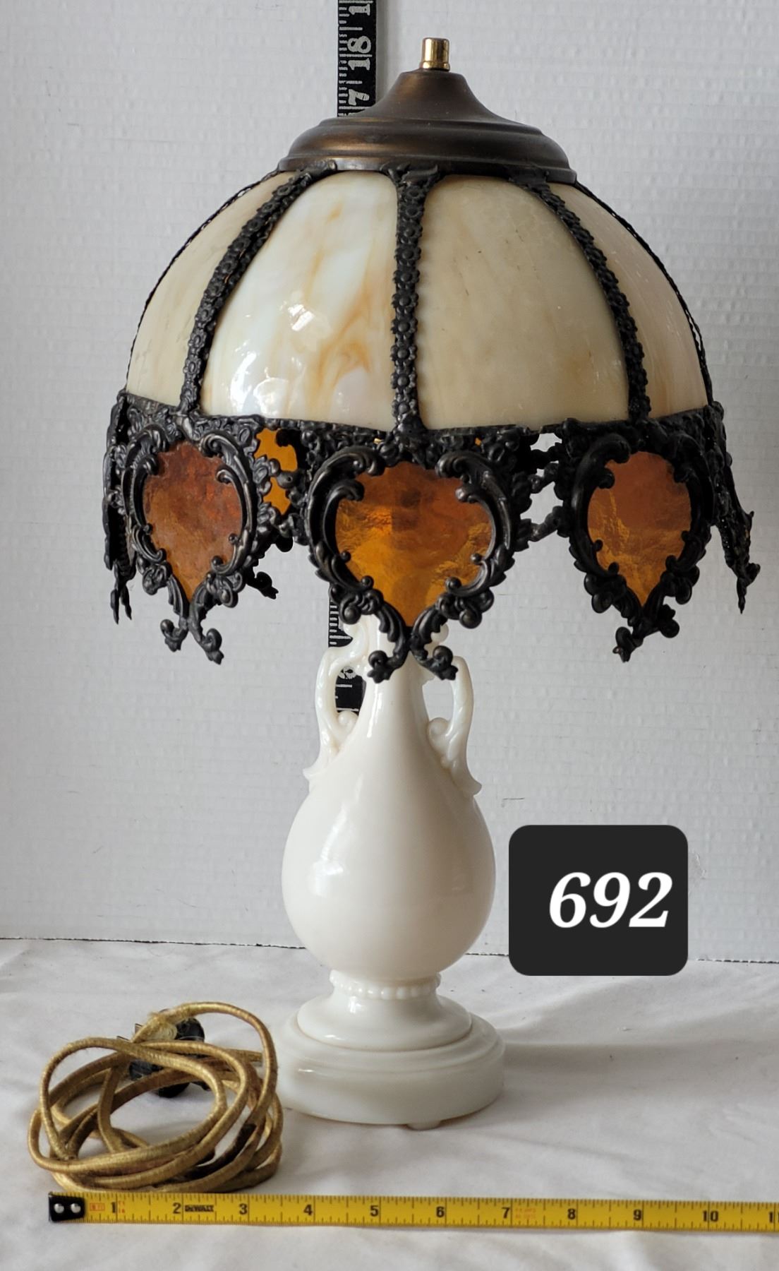 1940's Aladdin Ivory Alacite glass table lamp. Bakelite switch & original cloth cord. Shade is damaged & not original to the lamp.