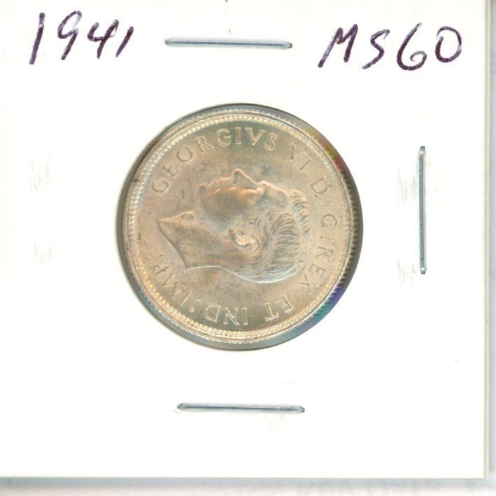 1941 Canadian Silver 25 Cents. World War II issue. MS-60. Bright White. Nice.