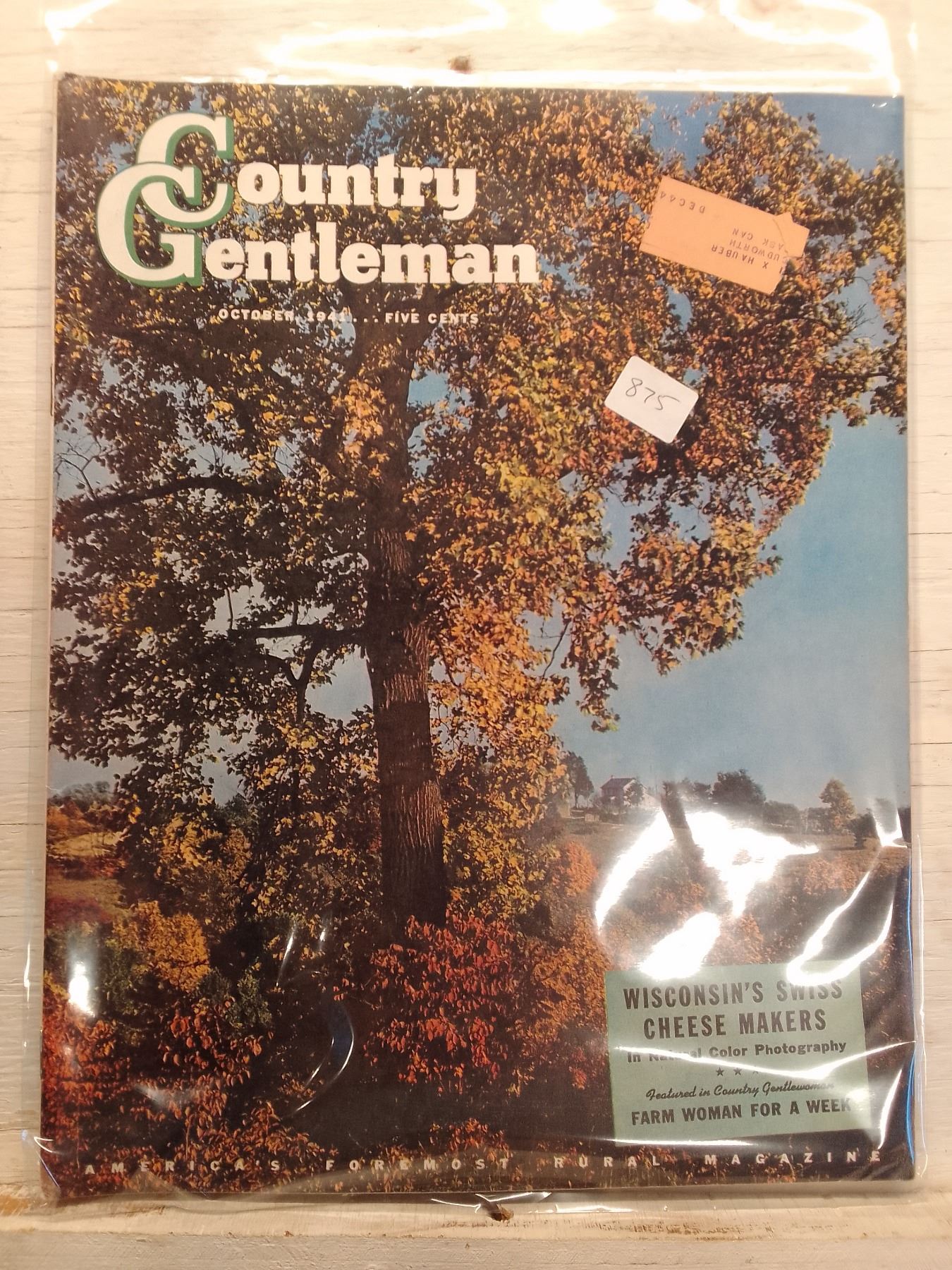 1941 Country Gentleman Cover: Autumn Tree in Natural Color Photography- Country Gentleman (1831–1955) was a leading American agricultural magazine, acquired by Curtis Publishing in 1911 and emphasizing the business of farming alongside rural lifestyle content. This October 1941 issue features a striking natural color photographic cover of a sunlit autumn tree in a rural landscape, highlighting Wisconsin's Swiss cheese makers and a "Farm Woman for a Week" profile. It was known as "America's Foremost Rural Magazine."
