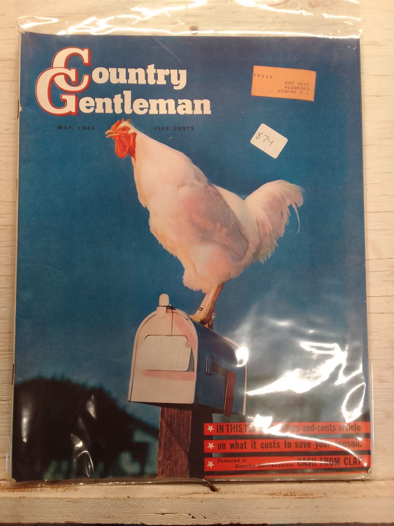1941 Country Gentleman Cover: White Rooster Perched on Rural Mailbo- Country Gentleman was a prominent American agricultural magazine (1831–1955), focusing on farming, rural life, business advice, and family content. Published by Curtis Publishing after 1911, it featured iconic illustrated covers. This May 1941 issue shows a humorous photographic cover of a proud white rooster standing atop a classic rural mailbox against a twilight sky.