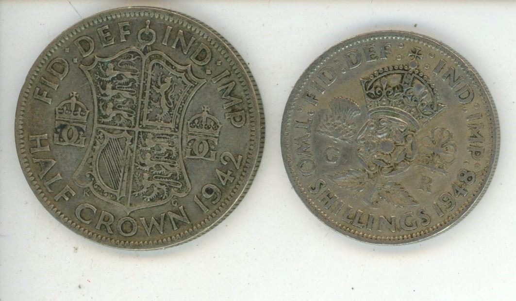 1942 British Half Crown George IVS VI D:G:BR:OMN:REX coin, & 1948 British 2 Shillings George IVS VI D:G:BR:OMN:REX coin