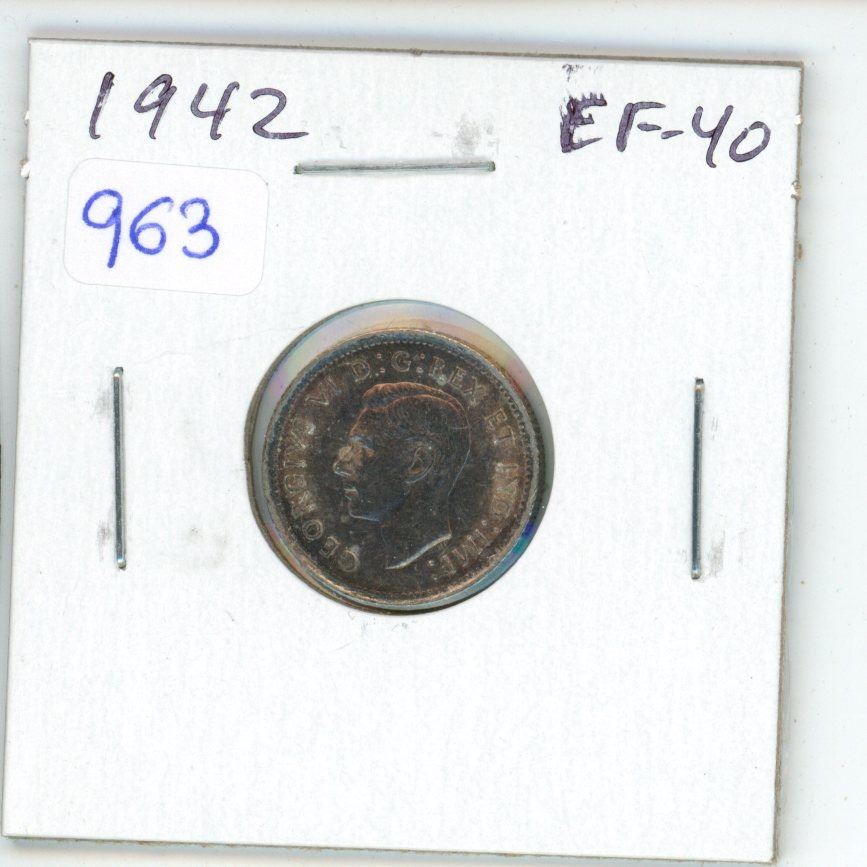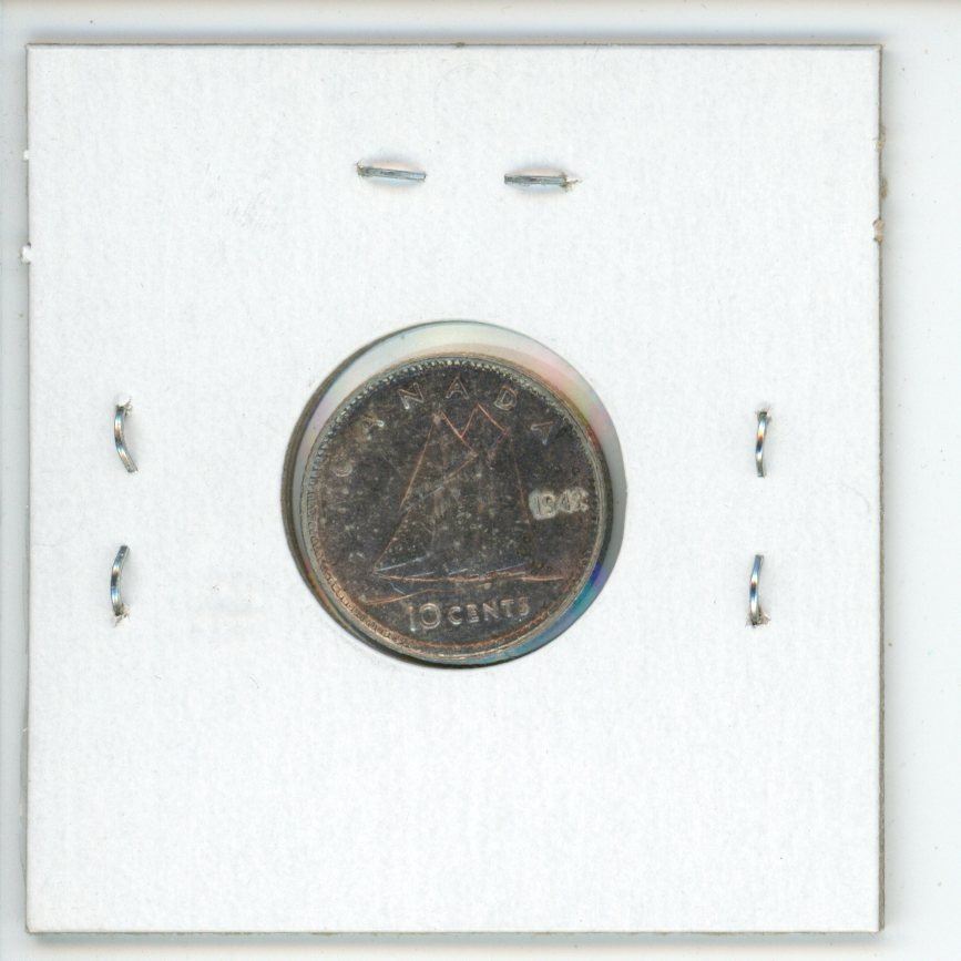 1942 Canadian Silver 10 Cents. World War II issue. EF-40. Nicely Toned.