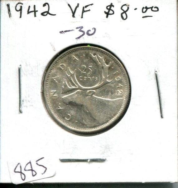 1942 Canadian Silver 25 Cents. World War II issue. VF-30.