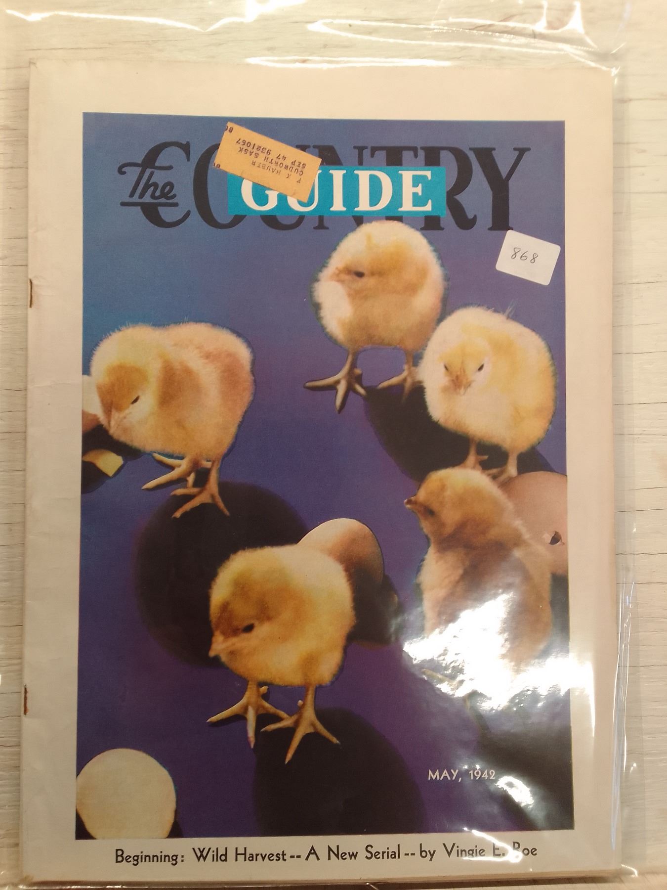 1942 Country Guide Cover: Adorable Fluffy Chicks and Eggs- The Country Guide is Canada's historic rural magazine, serving farmers since 1908 with practical advice, news, and family features. This May 1942 issue, during wartime, features a charming photographic cover of newly hatched yellow chicks gathered around eggs on a blue background. It highlights poultry farming and includes the start of a new serial "Wild Harvest" by Vingie E. Roe. Still published today as Country Guide.