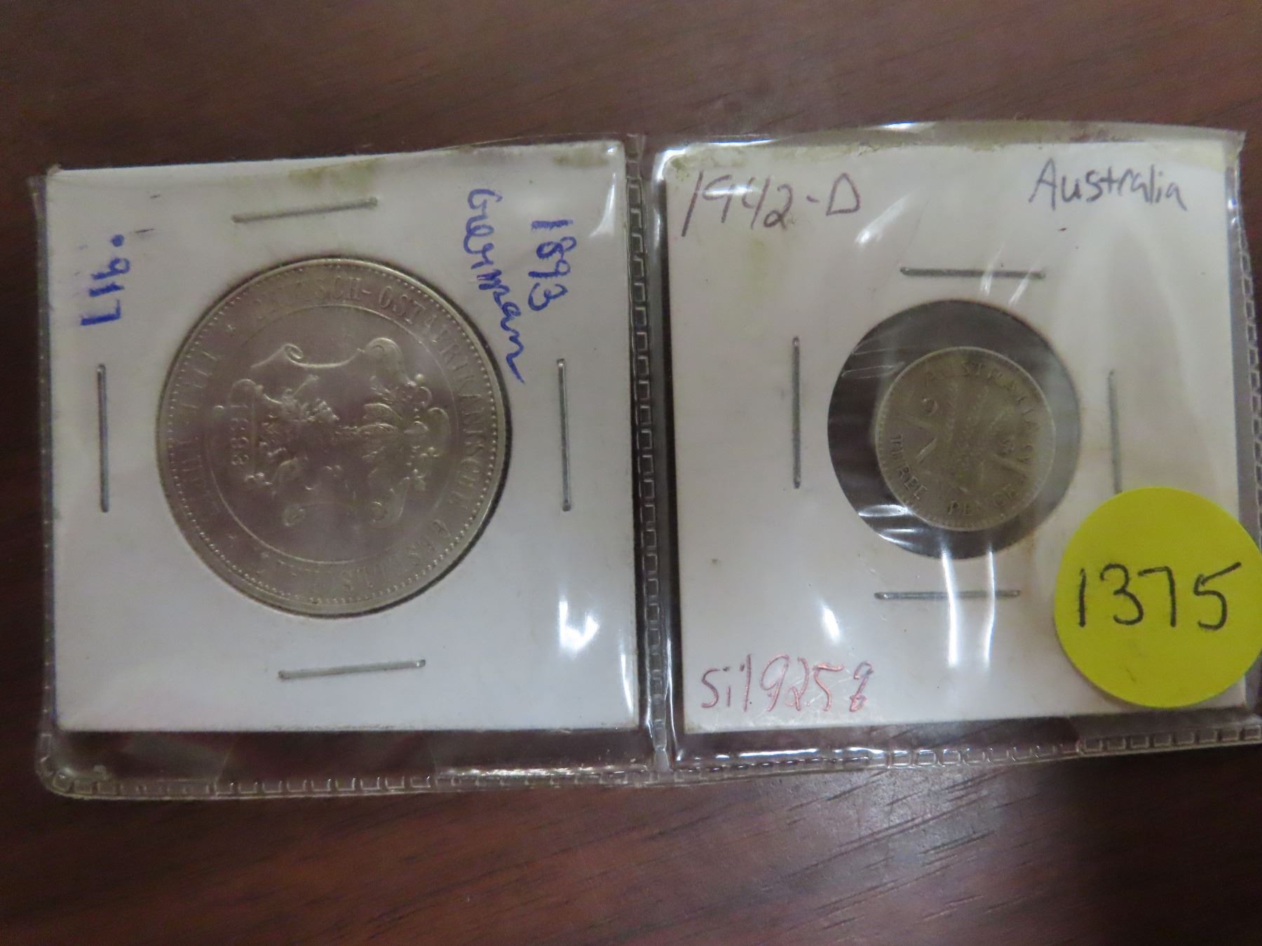 1942 -D australia three pence -9.25% silver and 1893 german eine ruple-.917 silver