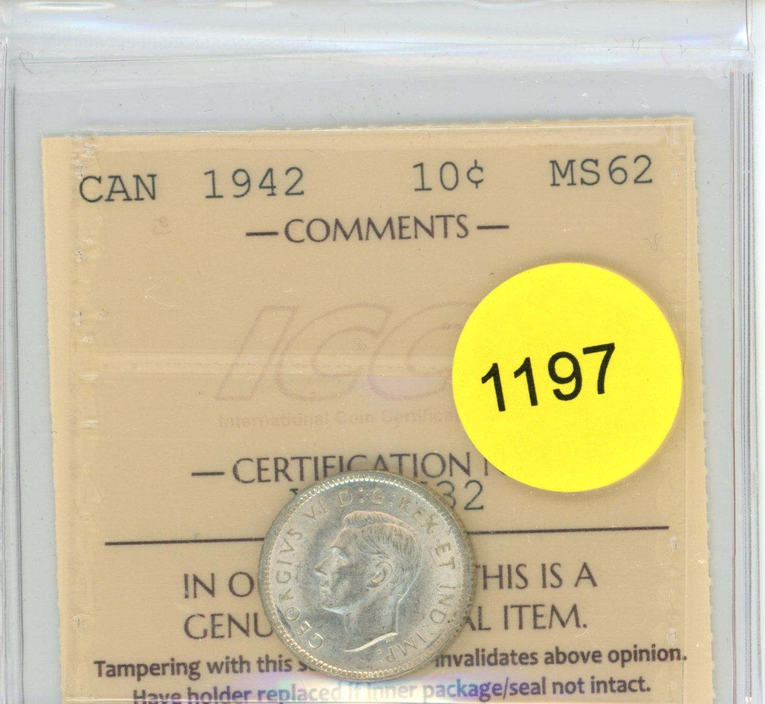 1942 MS62 ICCS Graded Canadian Ten Cent Coin
