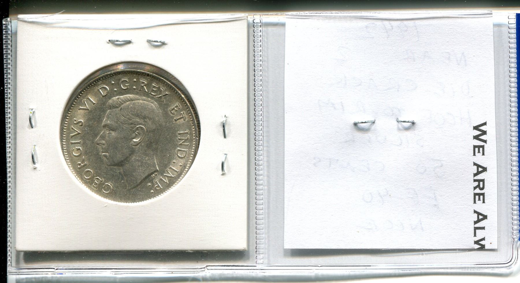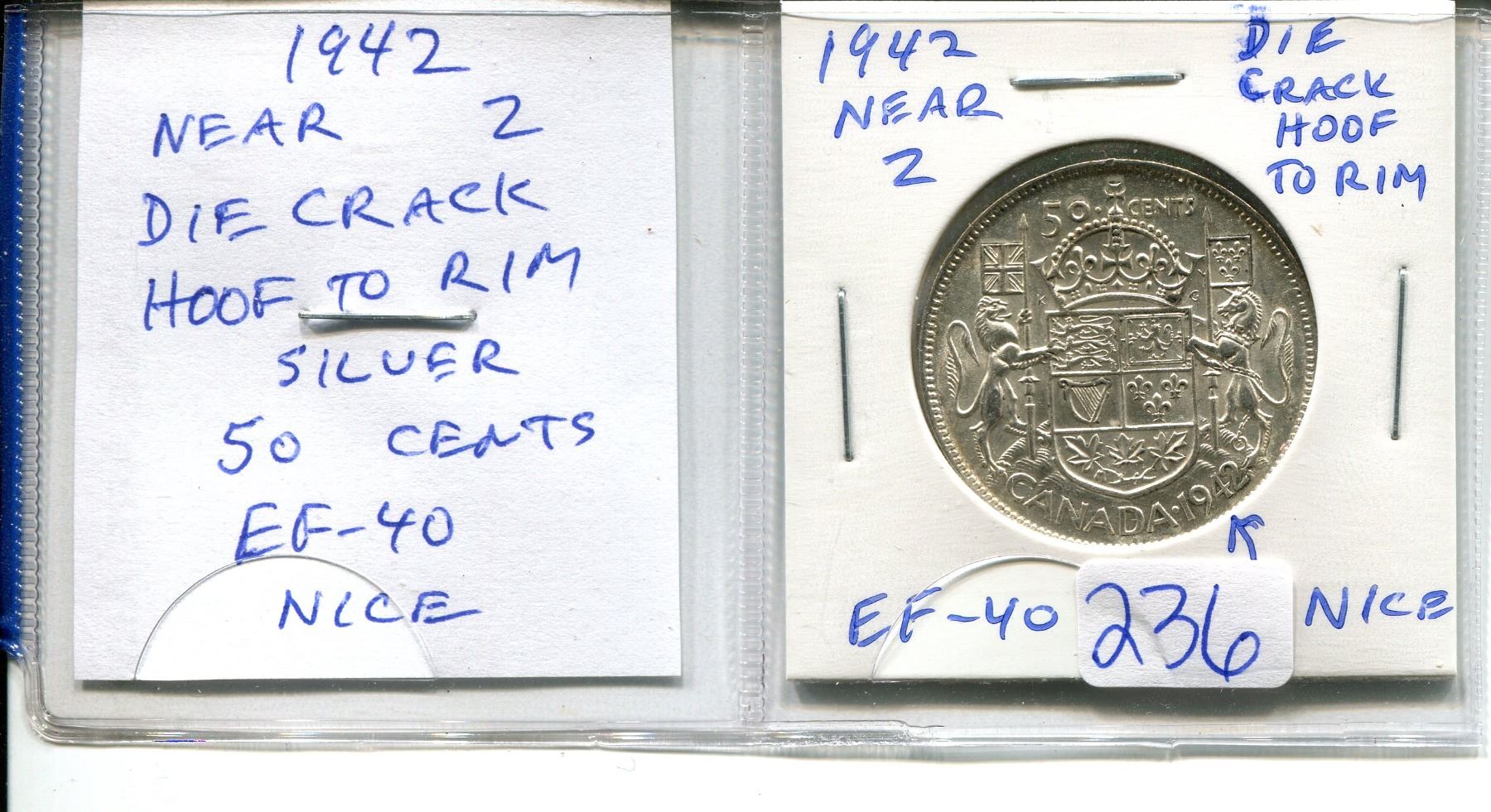 1942 Near 2 Silver 50 cents. Coin displays a large Die Crack from the Hoof to the Rim. An interesting and scarce variety. EF-40. Nice.
