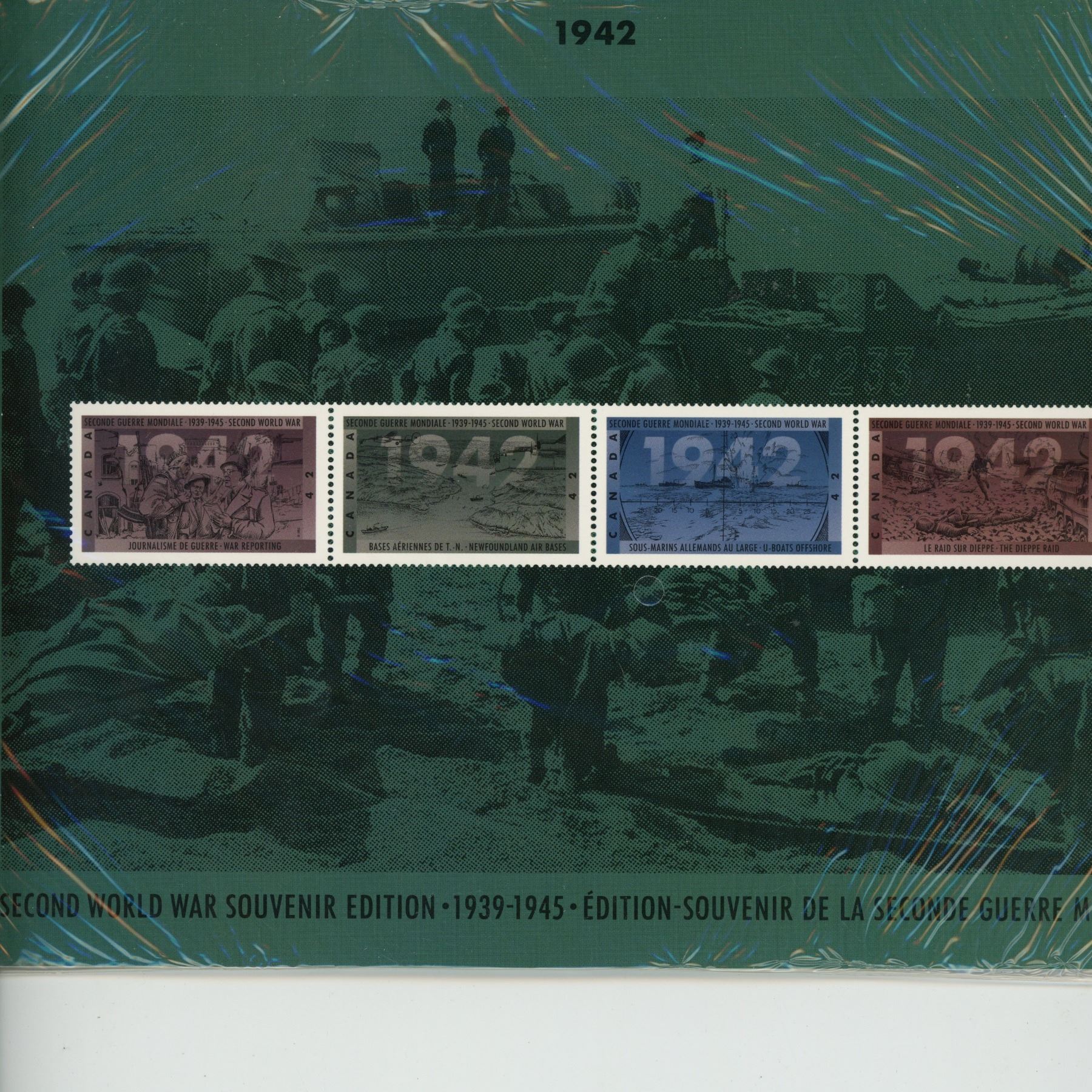 1942 Second World War Commemorative 42 Cent Stamps. War Reporting, NFLD air bases, U-Boats & Dieppe. Housed in its unopened Canada Post packaging. Mint.