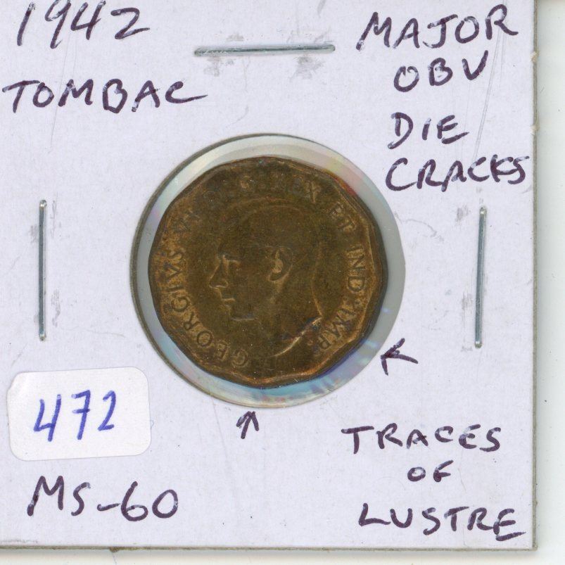 1942 Tombac 5 Cents. Major Obverse Die Cracks. MS-60 with Traces of Lustre.