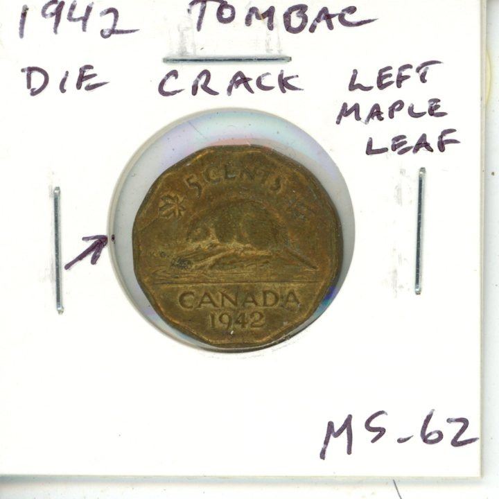 1942 Tombac 5 Cents with Die Crack from Left Maple Leaf to Rim MS-62. Traces of Lustre.