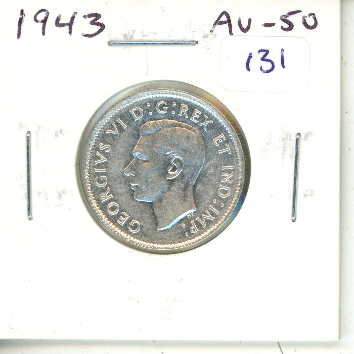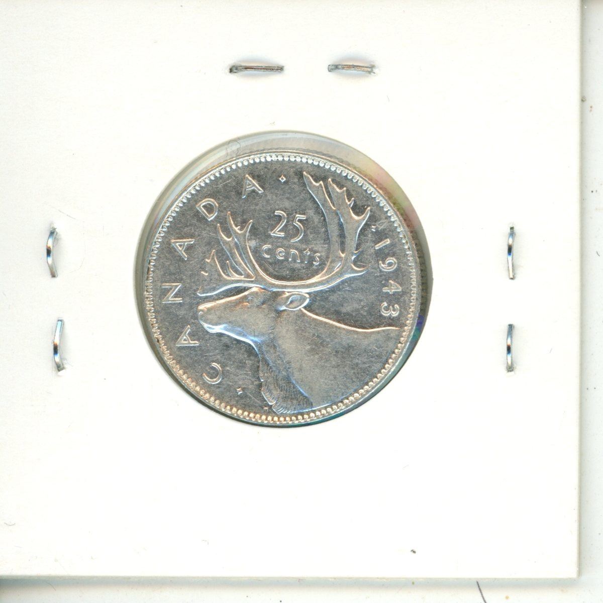 1943 Canadian Silver 25 Cents. World War II issue. AU-50. Bright White.