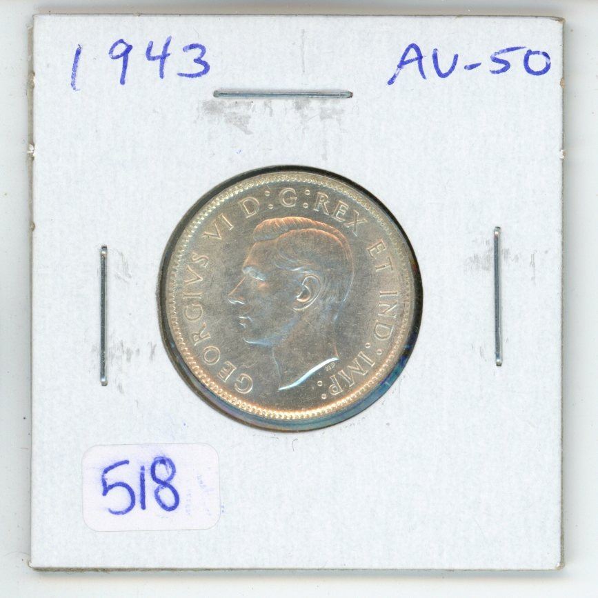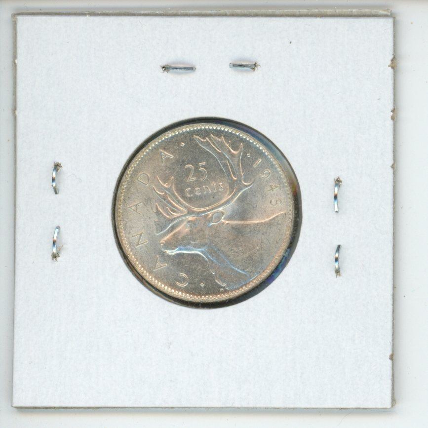 1943 Canadian Silver 25 Cents. World War II issue. AU-50. Lustrous.