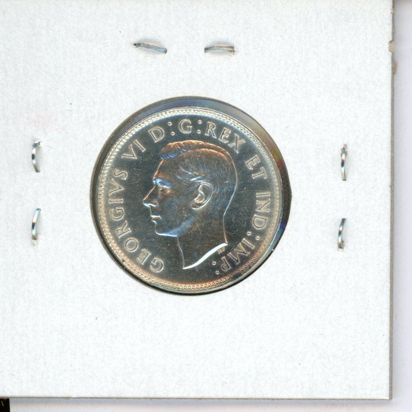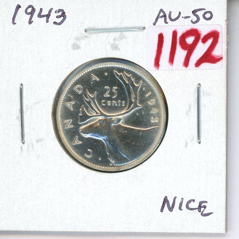 1943 Canadian Silver 25 Cents. World War II issue. AU-50. Nice.