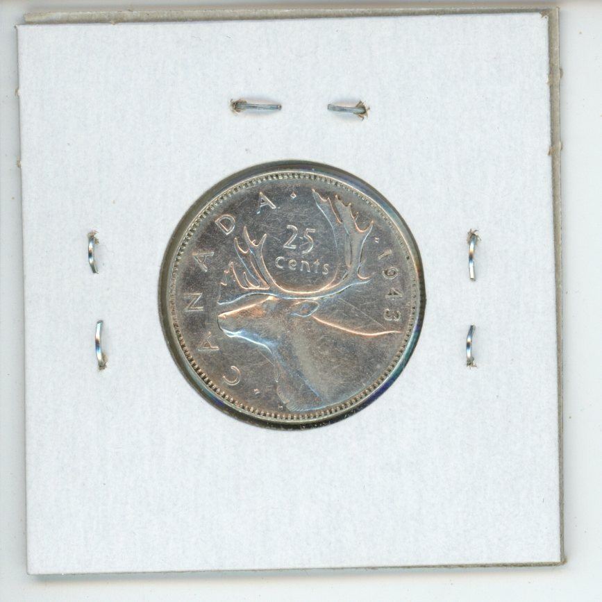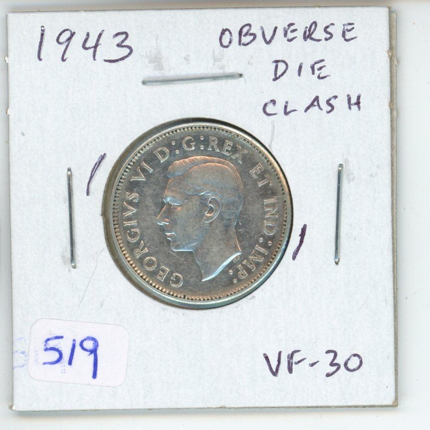 1943 Canadian Silver 25 Cents with Obverse Die Clash in front of the king’s face & behind his head. VF-30. Scarce.