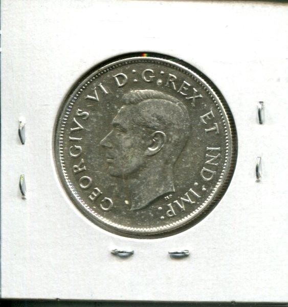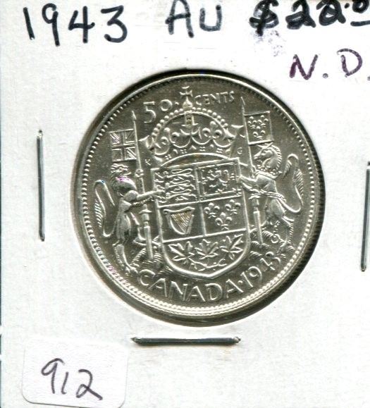 1943 Narrow Date Canadian Silver 50 Cents. AU-50. Nice.