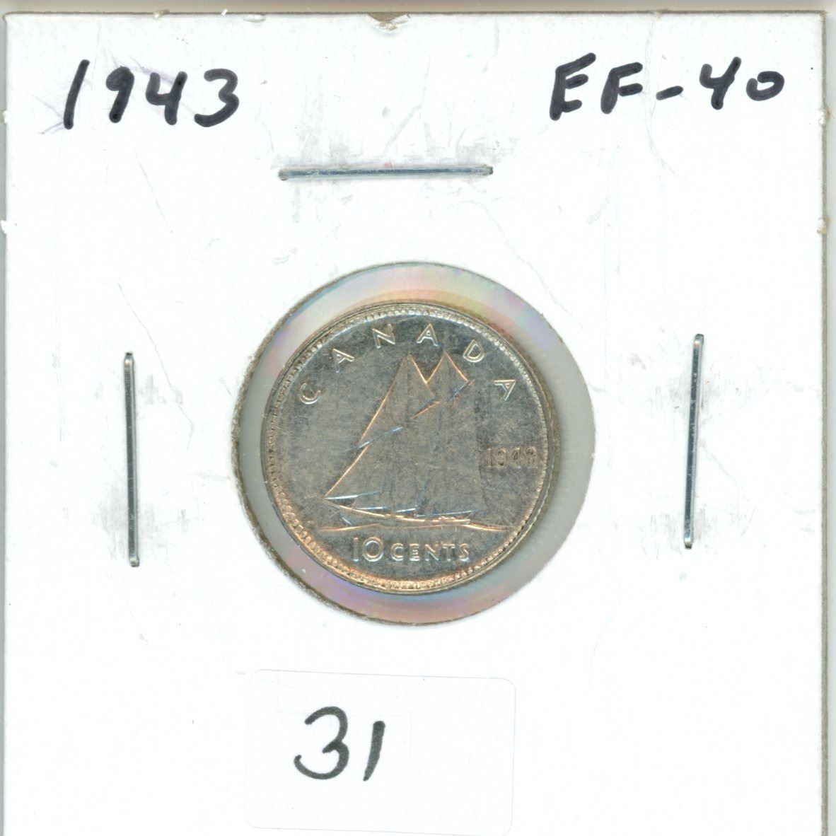 1943 Silver 10 Cents. World War II issue. EF-40.