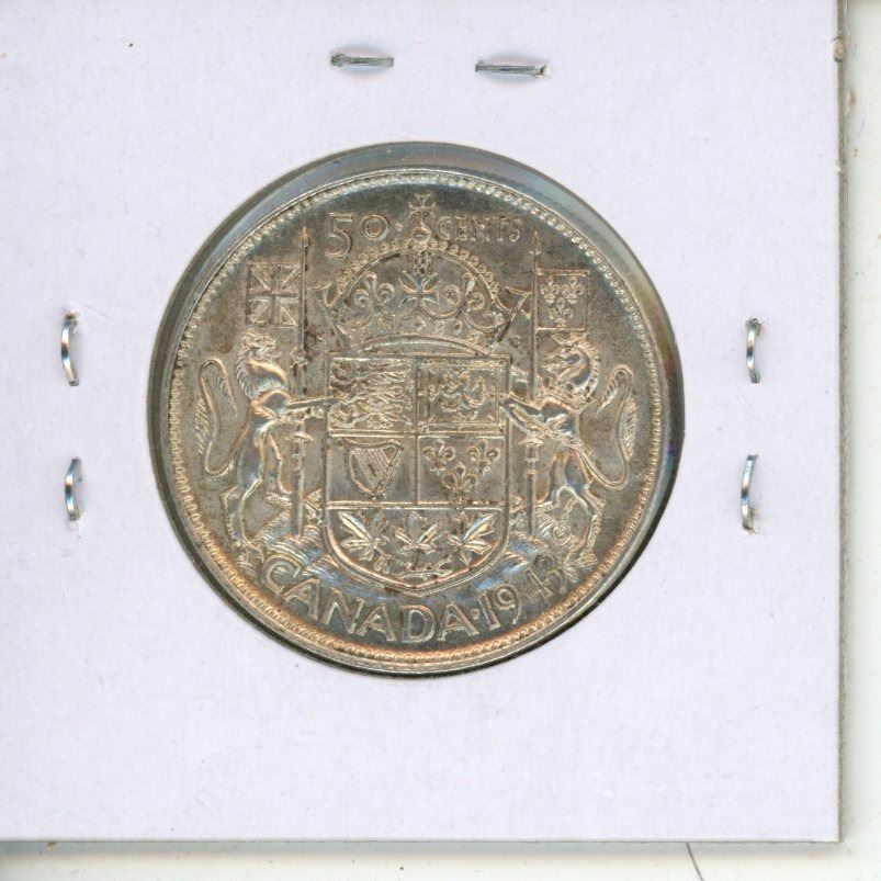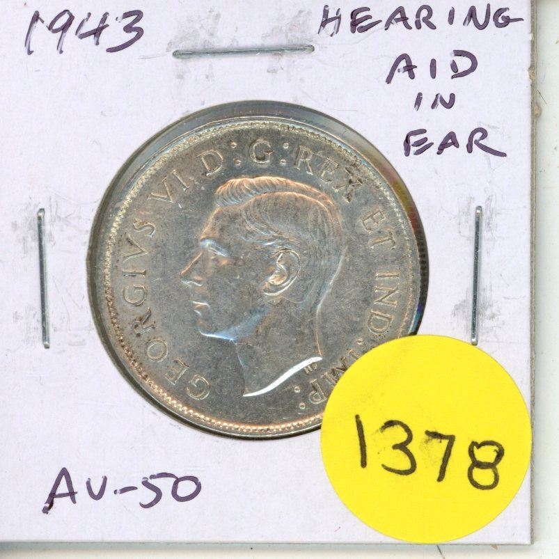 1943 Silver 50 Cents with Hearing Aid in the king’s ear from a Die Clash. AU-50. Scarce.