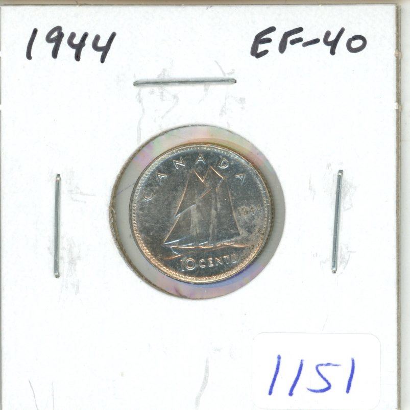 1944 Canadian Silver 10 Cents. Issued during World War II. EF-40. Nice.