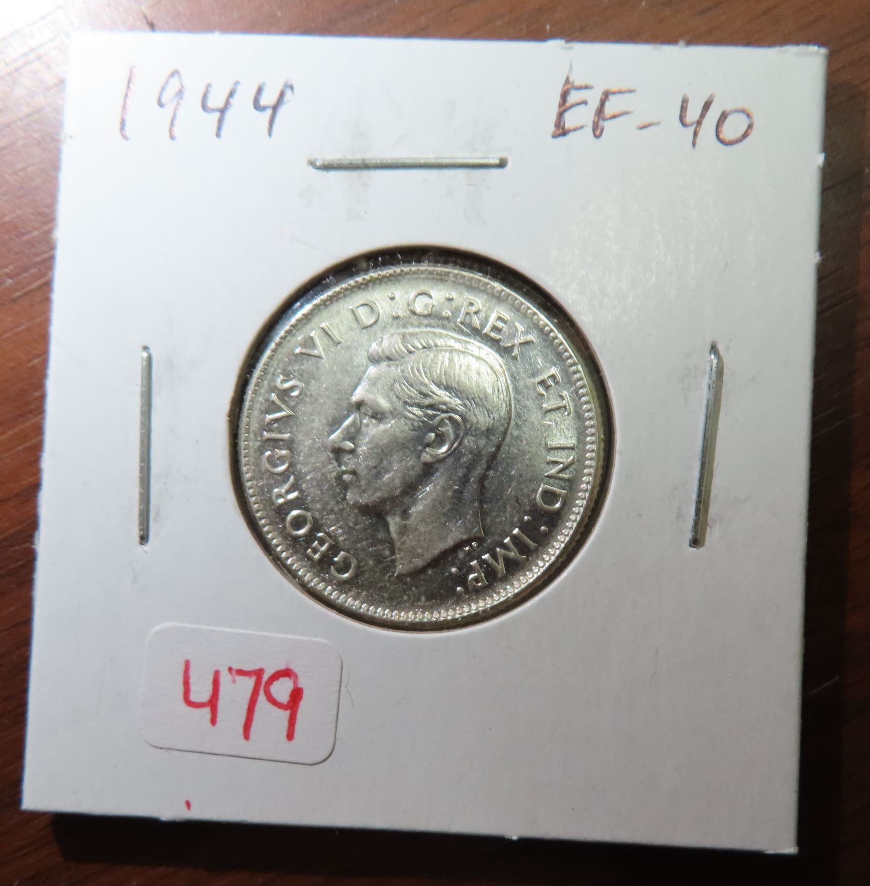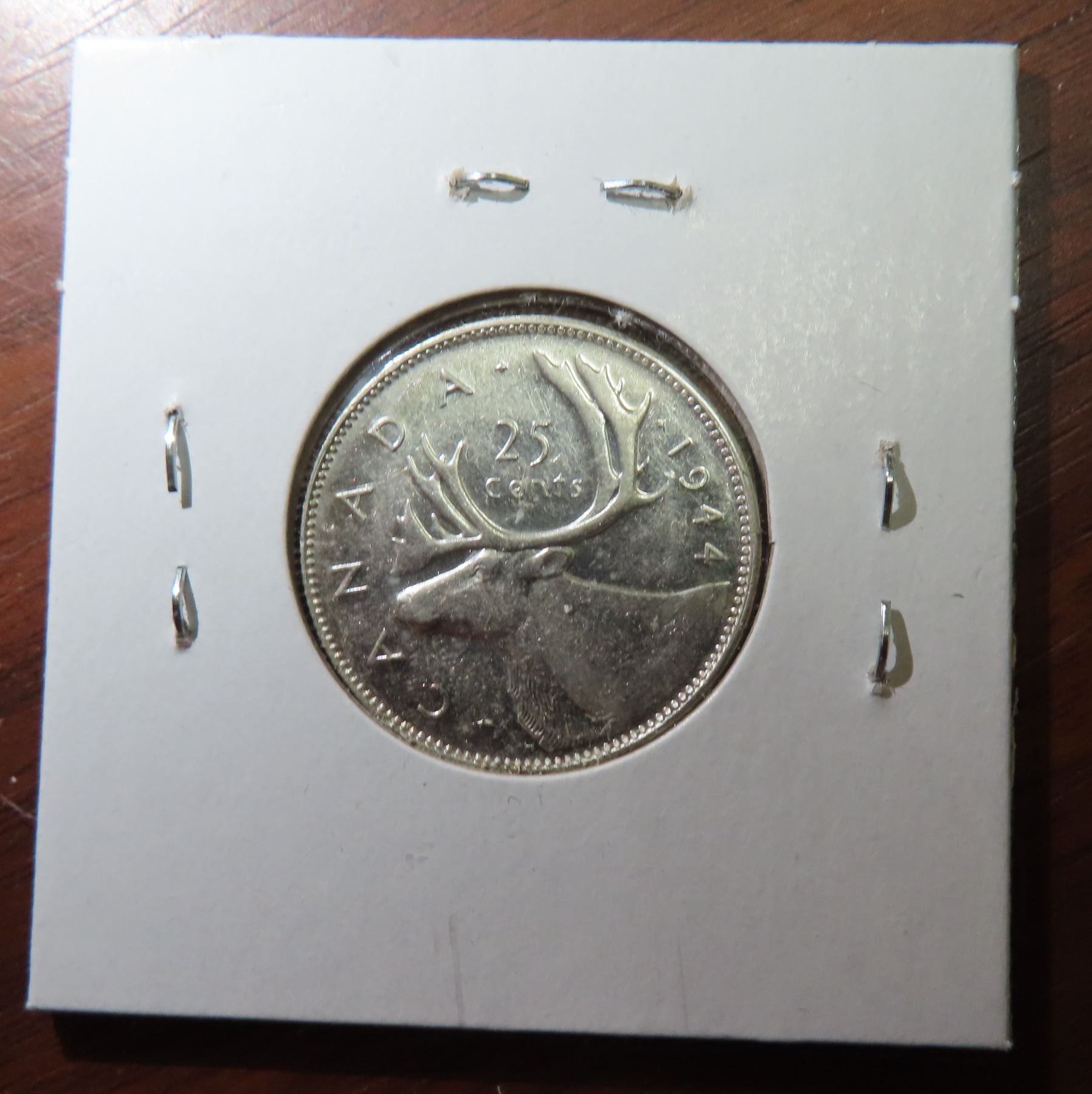 1944 Canadian Silver 25 Cents. Issued during World War II. EF-40.