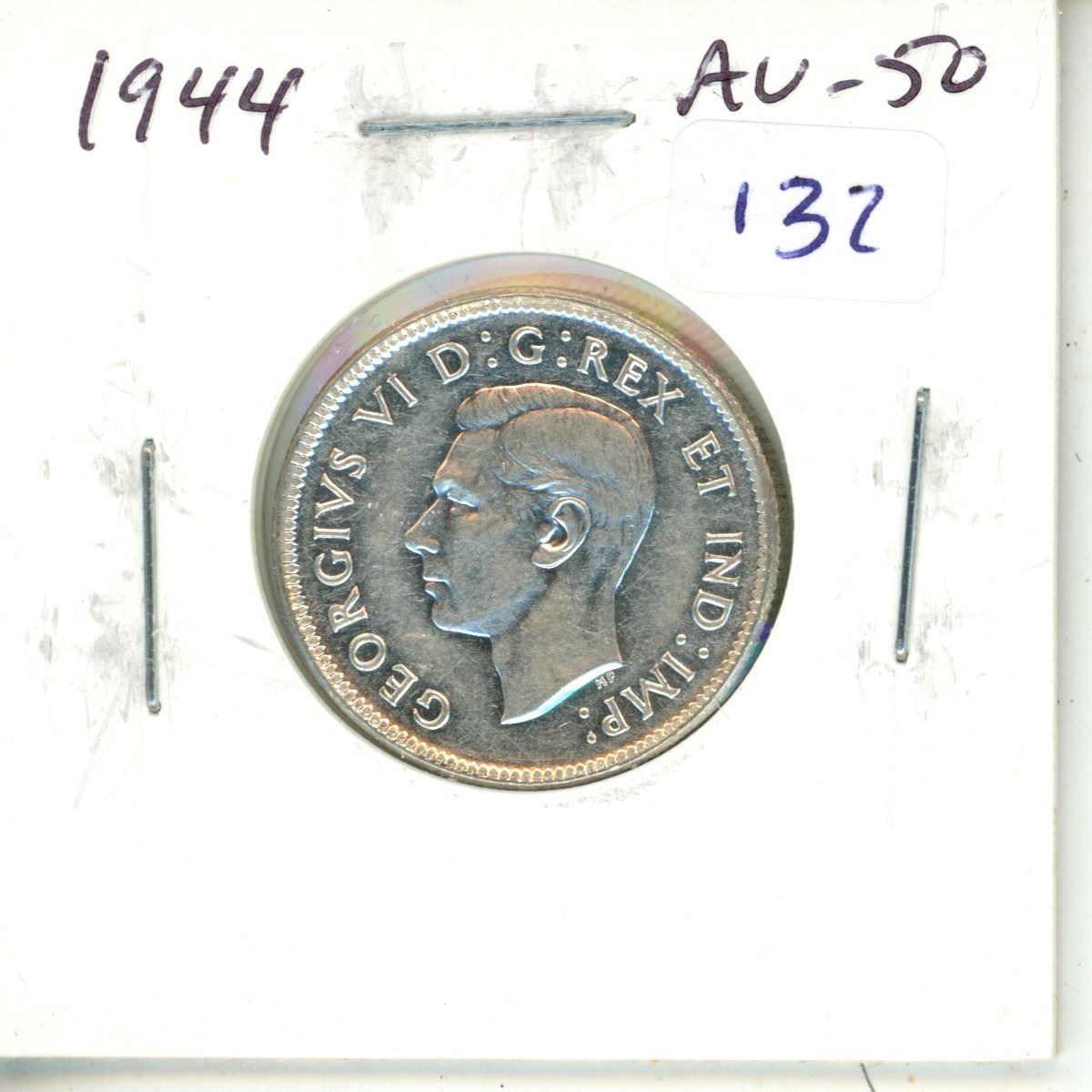 1944 Canadian Silver 25 Cents. World War II issue. AU-50. Bright White.