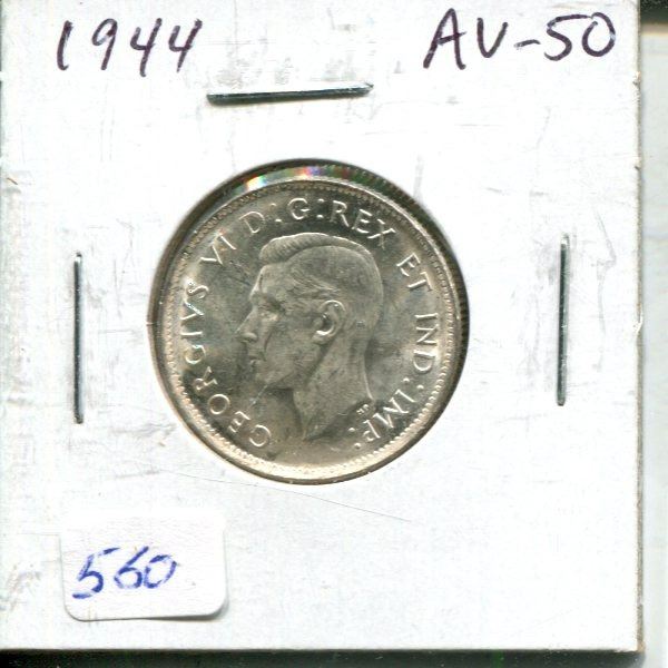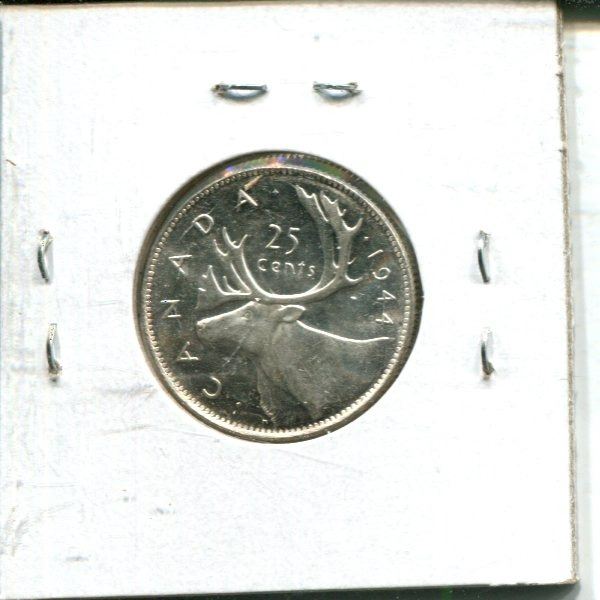1944 Canadian Silver 25 Cents. World War II issue. AU-50. Nice.