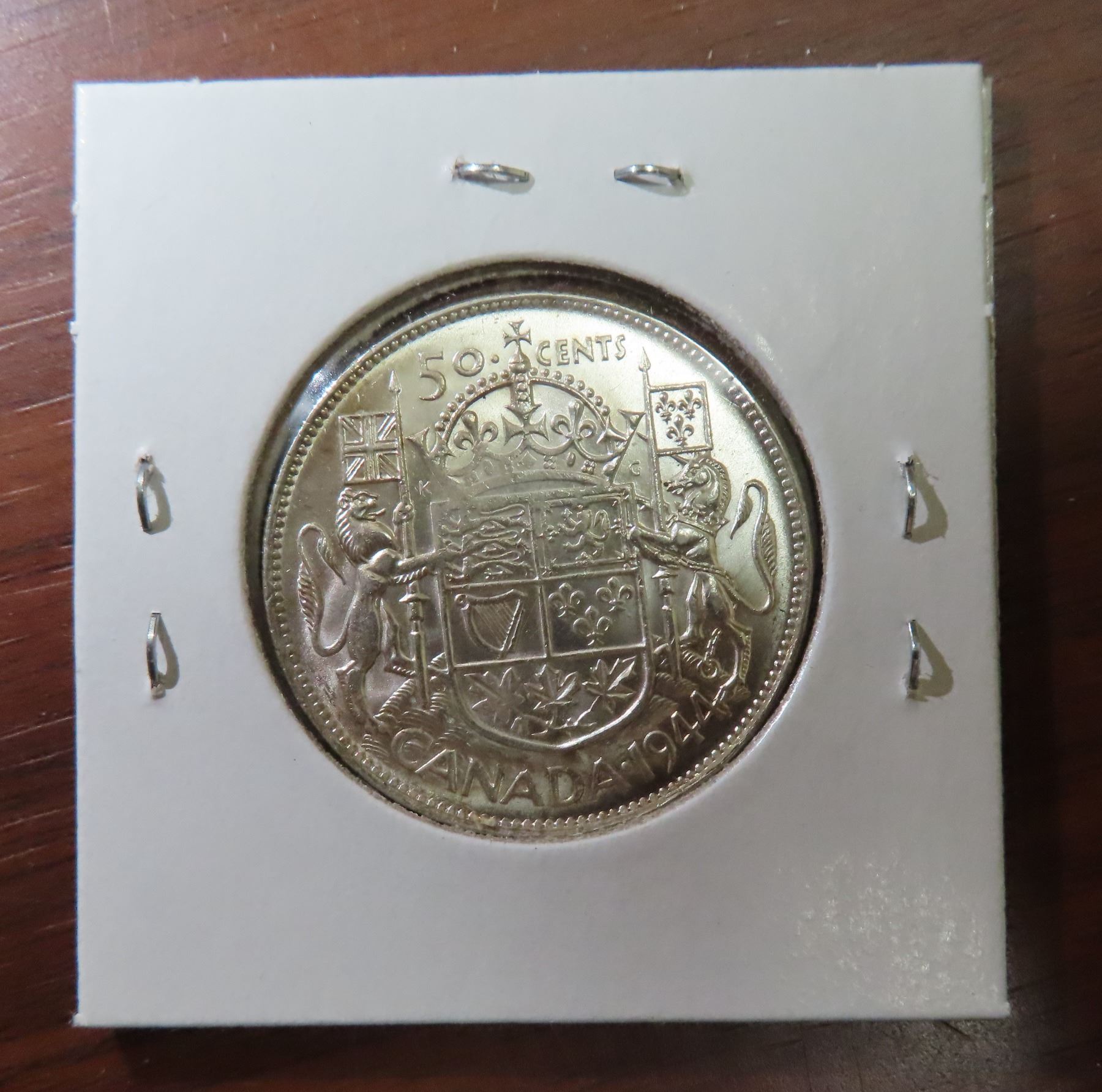 1944 Canadian Silver 50 Cents. Minted during World War II. AU-50. Lustrous.