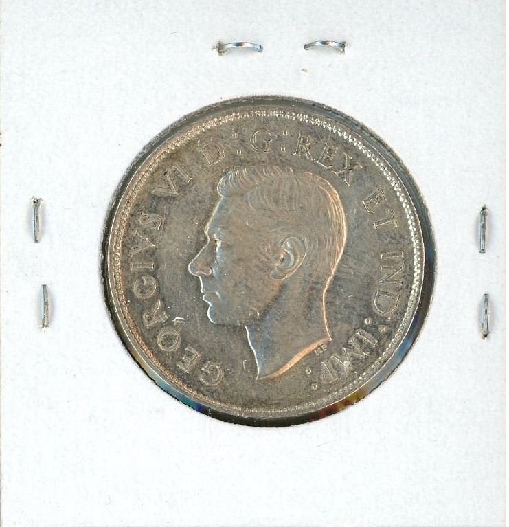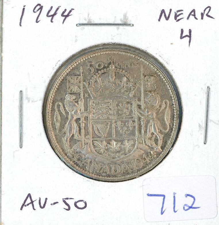 1944 Canadian Silver 50 Cents. Near 4 in Date. AU-50.