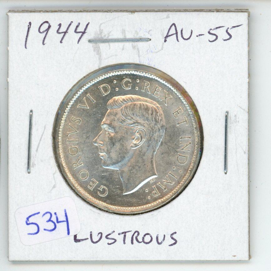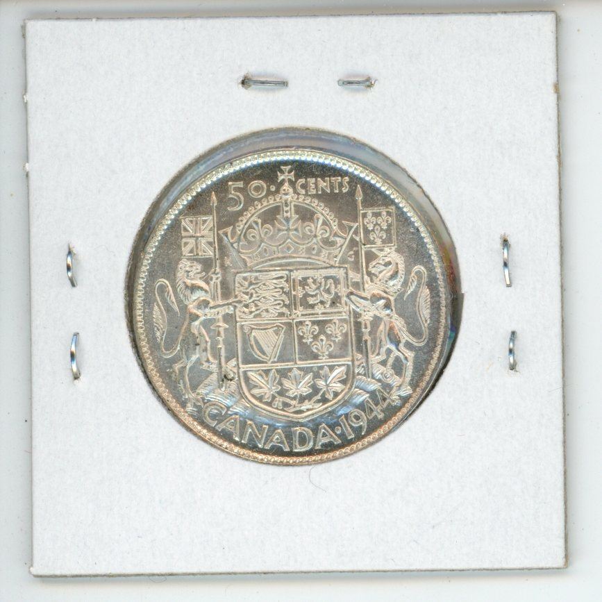 1944 Canadian Silver 50 Cents. World War II issue. AU-55. Lustrous.