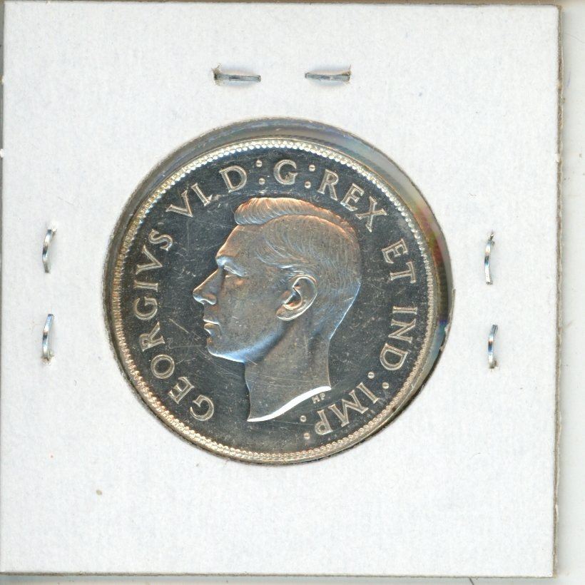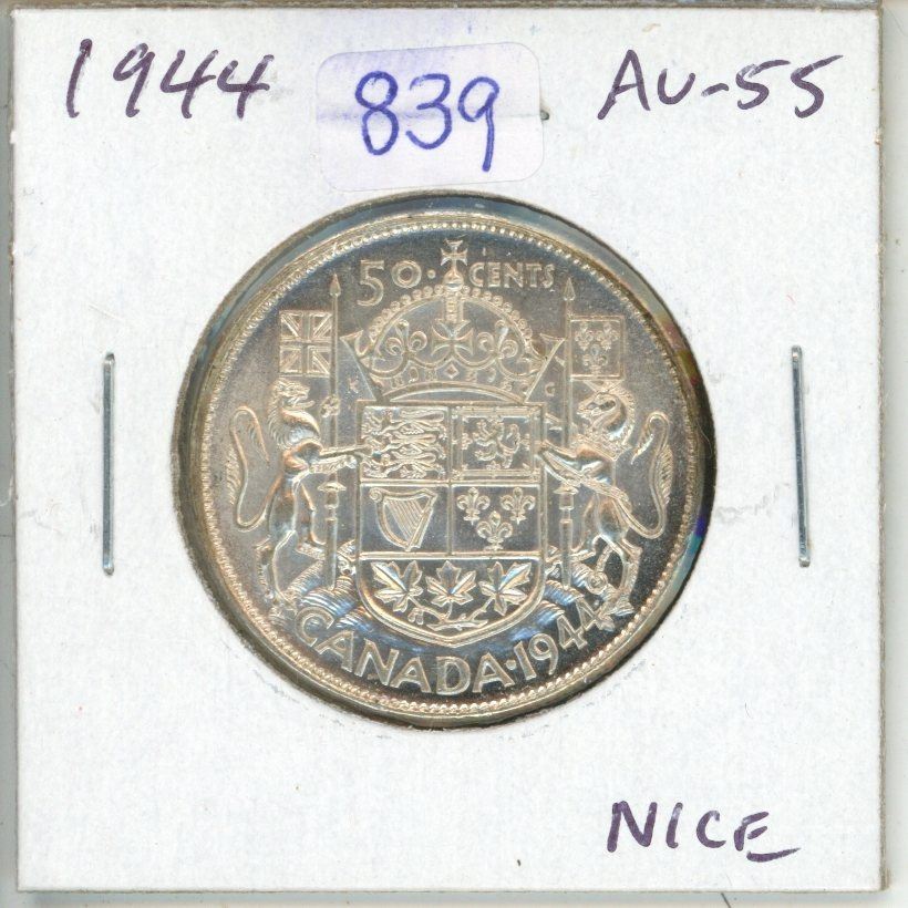 1944 Canadian Silver 50 Cents. World War II issue. AU-55. Nice.